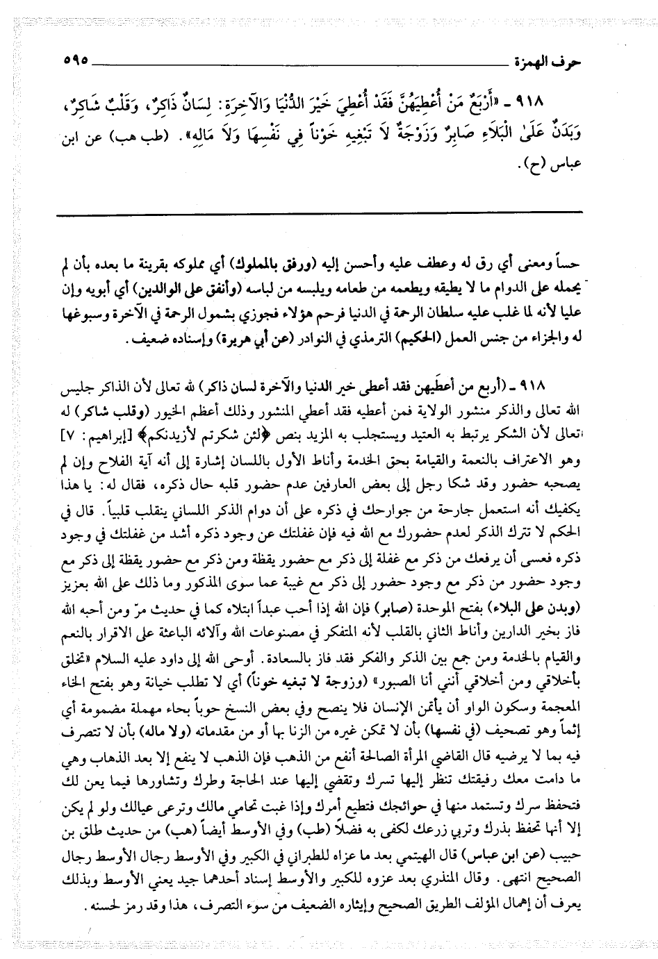 918 - (أربع من أعطيهن فقد أعطي خير الدنيا والآخرة لسان ذاكرا لله تعالى لأن الذاكر جليس الله تعالى والذكر منشور الولاية فمن أعطيهن فقد أعطي المنشور وذلك أعظم الخيور (وقلب شاكر) له تعالى لأن الشكر يرتبط به العتيد ويستجلب به المزيد بنص * (ولئن شكرتم لأزيدنكم) * (إبراهيم : 7) وهو الاعتراف النعمة والقيام بحق الخدمة وأناط الأول باللسان إشارة إلى أنه آية الفلاح وإن لم يصحبه حضور وقد شكا رجل إلى بعض العارفين عدم حضور قلبه حال ذكره فقال له يا هذا يكفيك أنه استعمل جارحة من جوارحك في ذكره على أن دوام الذكر اللساني ينقلب قلبيا.