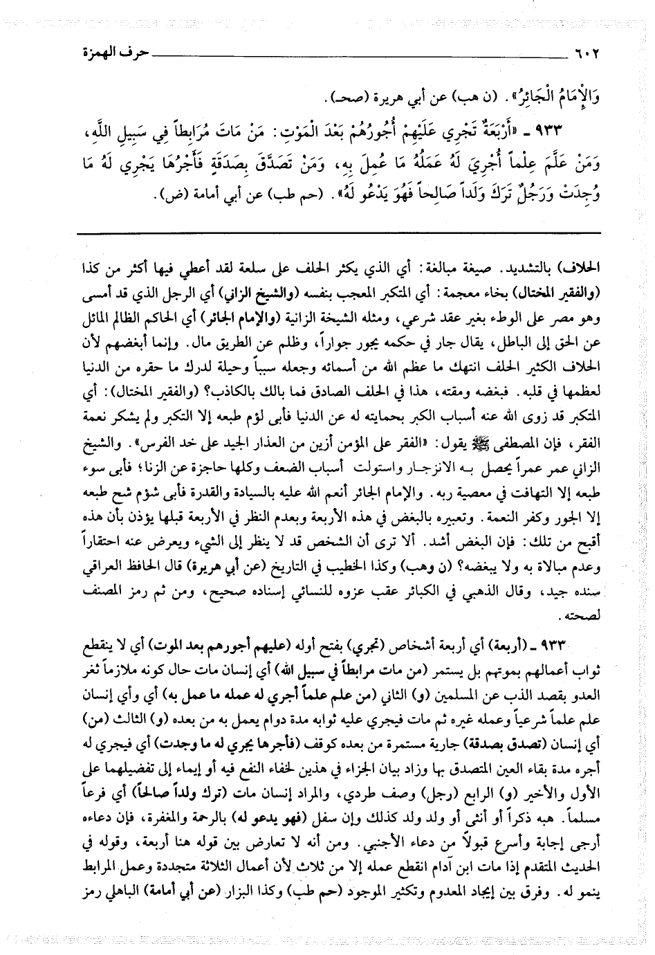 933 - (أربعة) أي أربعة أشخاص (تجري) بفتح أوله (عليهم أجورهم بعد الموت) أي لا ينقطع ثواب أعمالهم بموتهم بل يستمر (من مات مرابطا في سبيل الله) أي إنسان مات حال كونه ملازما ثغر العدو بقصد الذب عن المسلمين (و) الثاني (من علم علما أجرى له عمله ما عمل به) أي وأي إنسان علم علما وعمله غيره ثم مات فيجري عليه ثوابه مدة دوام العمل به من بعده (و) الثالث (من) أي إنسان (تصدق بصدقة) جارية مستمرة من بعده كوقف (فأجرها يجري له ما وجدت أي فيجري له أجره مدة بقاء العين المتصدق بها وزاد بيان الجزاء في هذين لخفاء النفع فيه أو إيماء إلى تفضيلهما على الأول والأخير (و) الرابع (رجل) وصف طردي ، والمراد إنسان مات (ترك ولدا صالحا) أي فرعا مسلما.