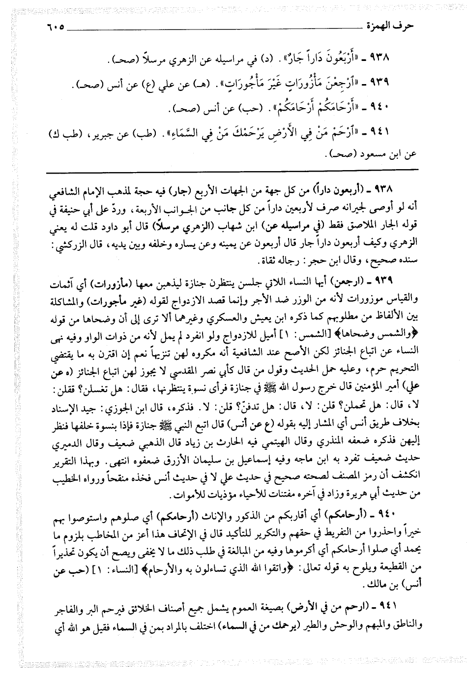 938 - (أربعون دارا) من كل جهة من الجهات الأربع (جار) فيه حجة لمذهب الإمام الشافعي أنه لو أوصى لحيرانه صرف لأربعين دارا من كل جانب من الجوانب الأربعة ، ورد على أبي حنيفة في قوله الجار الملاصق فقط (في مراسيله عن) ابن شهاب (الزهري مرسلا) قال أبو داود قلت له يعني الزهري وكيف أربعون دارا جار قال أربعون عن يمينه وعن بساره وخلفه وبين يديه قال الزركشي : سنده صحيح وقال ابن حجر رجاله ثقات.
