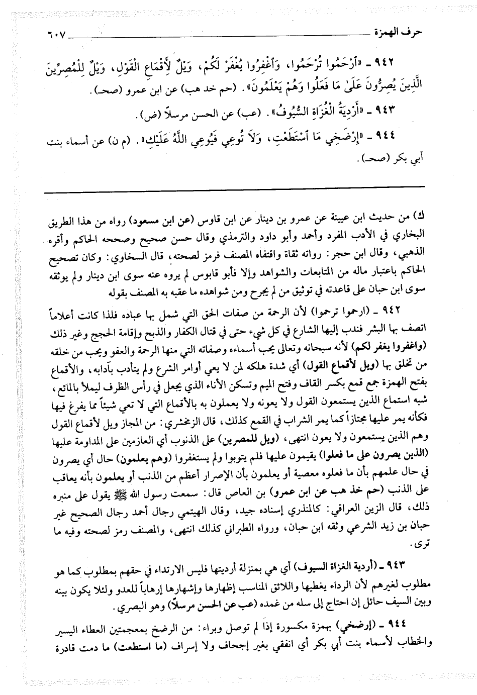 البخاري في الأدب المفرد وأحمد وأبو داود والترمذي وقال حسن صحيح وصححه الحاكم وأقره الذهبي وقال ابن حجر رواته ثقات واقتفاه المصنف فرمز لصحته قال السخاوي وكان تصحيح الحاكم باعتبار ما له من المتابعات والشواهد وإلا فأبو قابوس لم يروه عنه سوى ابن دينار ولم يوثقه سوى ابن حبان على قاعدته في توثيق من لم يجرح ومن شواهد ما عقبه به المصنف بقوله : 942 - (ارحموا ترحموا) لأن الرحمة من صفات الحق التي شمل بها عباده فلذا كانت أعلاما اتصف بها البشر فندب إليها الشارع في كل شئ حتى في قتال الكفار والذبح وإقامة الحجج وغير ذلك (واغفروا يغفر لكم) لأنه سبحانه وتعالى يحب أسمائه وصفاته التي منها الرحمة والعفو ويحب من خلقه من تخلق بها (ويل لأقماع القول) أي شدة هلكة لمن لا يعي أوامر الشرع ولم يتأدب بآدابه ، والأقماع بفتح الهمزة جمع قمع بكسر القاف وفتح الميم وتسكن الإناء الذي يجعل في رأس الظرف ليملأ بالمائع ، شبه استماع الذين يستمعون القول ولا يعونه ولا يعملون به بالأقماع التي لا تعي شيئا مما يفرغ فيها فكأنه يمر عليها مجتازا كما يمر الشراب في القمع كذلك قال الزمخشري : من المجاز ويل لأقماع القول وهم الذين يستمعون ولا يعون انتهى (ويل للمصرين) على الذنوب أي العازمين على المداومة عليها (الذين يصرون على ما فعلوا) يقيمون عليها فلم يتوبوا ولم يستغفروا (وهم يعلمون) حال أي يصرون في حال علمهم بأن ما فعلوه معصية أو يعلمون بأن الإصرار أعظم من الذنب أو يعلمون بأنه يعاقب على الذنب (حم خد هب عن ابن عمرو) ابن العاص قال سمعت رسول الله صلى الله عليه وسلم على منبره ذلك قال الزين العراقي كالمنذري إسناده جيد وقال الهيتمي رجال أحمد رجال الصحيح غير حبان بن زيد الشرعي وثقه ابن حبان ورواه الطبراني كذلك انتهى.