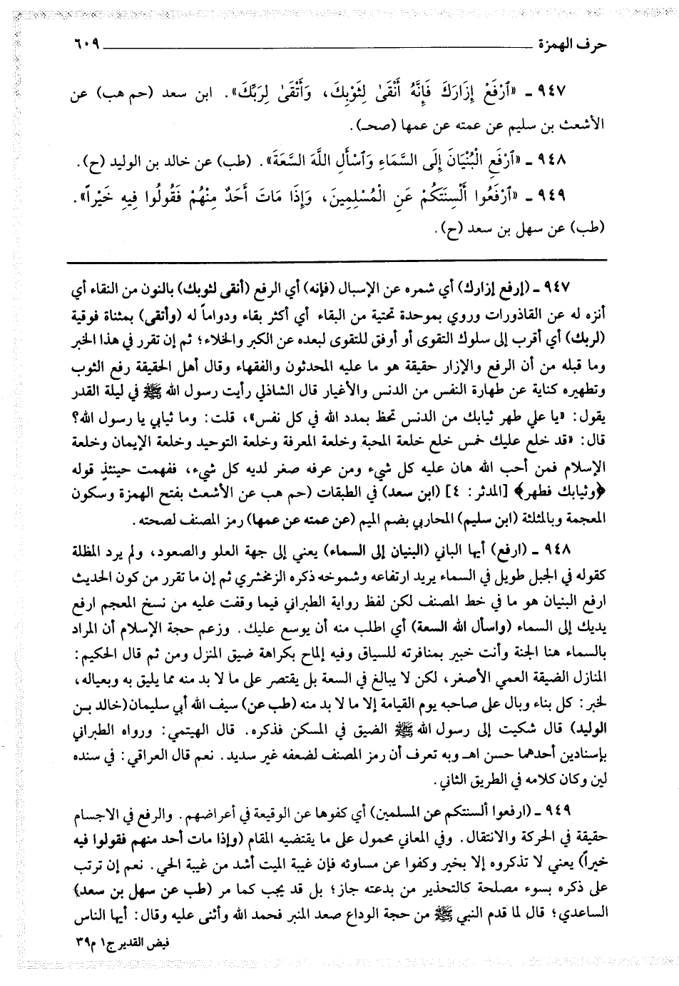 947 - (ارفع إزارك) أي شمره عن الإسبال (فإنه) أي الرفع (أنقى لثوبك) بالنون من النقاء أي أنزه له عن القاذورات وروي بموحدة تحتية من النقاء أي أكثر بقاءا ودواما له (وأتقى) بمثناة فوقية (لربك) أي أقرب إلى سلوك التقوى أو أوفق للتقوى لبعده عن الكبر والخيلاء ، ثم إن ما تقرر في هذا الخبر وما قبله من أن الرفع والإزار حقيقة هو ما عليه المحدثون والفقهاء وقال أهل الحقيقة رفع الثوب وتطهيره كناية عن طهارة النفس من الدنس والأغيار قال الشاذلي رأيت رسول الله صلى الله عليه وسلم في ليلة القدر يقول يا علي طهر ثيابك من الدنس تحظ بمدد الله في كل نفس قلت وما ثيابي يا رسول الله ؟ قال قد خلع عليك خمس خلع خلعة المحبة وخلعة المعرفة وخلعة التوحيد وخلعة الإيمان وخلعة الإسلام فمن أحب الله هان عليه كل شئ ففهمت حينئذ قوله * (وثيابك فطهر) * (ابن سعد) في الطبقات (حم هب عن الأشعث) بفتح الهمزة وسكون المعجمة وبالمثلثة (ابن سليم) المحاربي بضم الميم (عن عمته عن عمها) رمز المصنف لصحته.