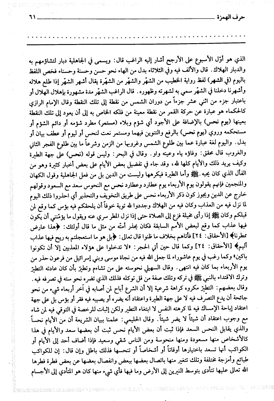 وأما الطيرة فيكرهها وليست من الدين بل من فعل الجاهلية وقول الكهان والمنجمين فانهم يقولون يوم الأربعاء يوم عطارد وعطارد نحس مع النحوس سعد مع السعود وقولهم خارج عن الدين ويجوز كون ذكر الأربعاء نحس على طريق التخويف والتحذير أي احذروا ذلك اليوم لما نزل فيه من العذاب وكان فيه من الهلاك وجددوا لله توبة خوفا أن يلحقكم فيه بؤس كما وقع لمن قبلكم وكان صلى الله عليه وسلم إذا رأى مخيلة فزع إلى الصلاة حتى إذا نزل المطر سري عنه ويقول ما يؤمنني أن يكون فيها عذاب كما وقع لبعض الأمم السابقة فكان يحذر أمته من مثل ما قال أولئك : * (هذا عارض ممطرنا) * فأتاهم بخلاف ما ظنوا قال تعالى : * (بل هو ما استعجلتم به ريح فيها عذاب