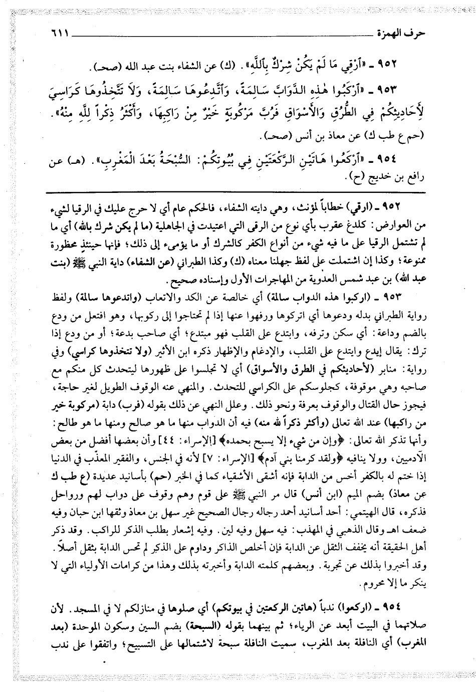 953 - (اركبوا هذه الدواب سالمة) أي خالصة عن الكد والإتعاب (واتدعوها سالمة) ولفظ رواية الطبراني بدله ودعوها أي اتركوها ورفهوا عنها إذا لم تحتاجوا إلى ركوبها ، وهو افتعل من ودع بالضم وداعة : أي سكن وترفه ، وابتدع على القلب فهو مبتدع ، أي صاحب بدعة ، أو من ودع إذا ترك يقال إيدع وابتدع على القلب ، والإدغام والإظهار ذكره ابن الأثير (ولا تتخذوها كراسي) وفي رواية : منابر (لأحاديثكم في الطرق والأسواق) أي لا تجلسوا على ظهورها ليتحدث كل منكم مع صاحبه وهي موقوفة ، كجلوسكم على الكراسي للتحدث.
