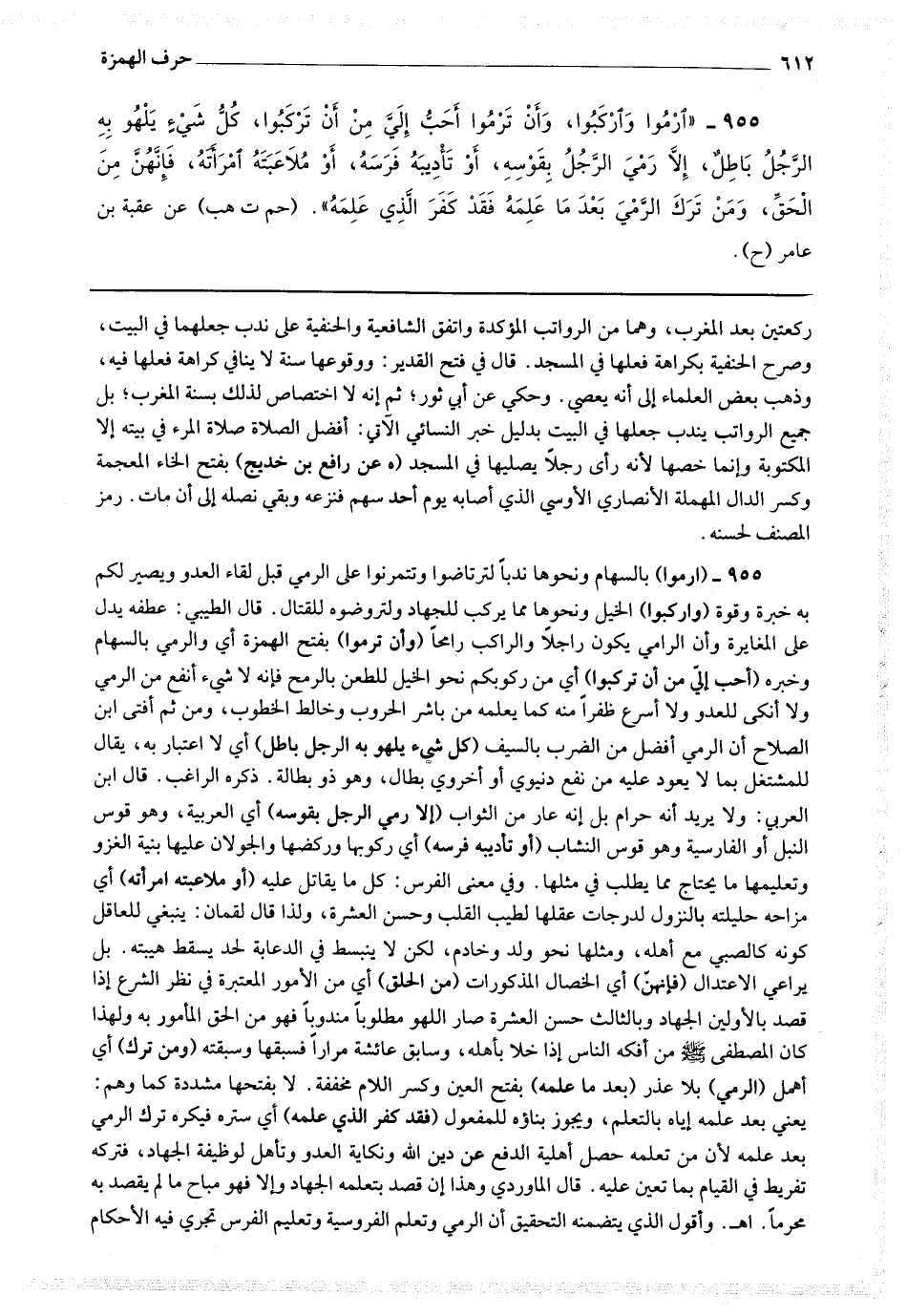 955 - (ارموا) بالسهام ونحوها ندبا لترتاضوا وتتمرنوا على الرمي قبل لقاء العدو ويصير لكم به خبرة وقوة (واركبوا) الخيل ونحوها مما يركب للجهاد ولتروضوه للقتال.