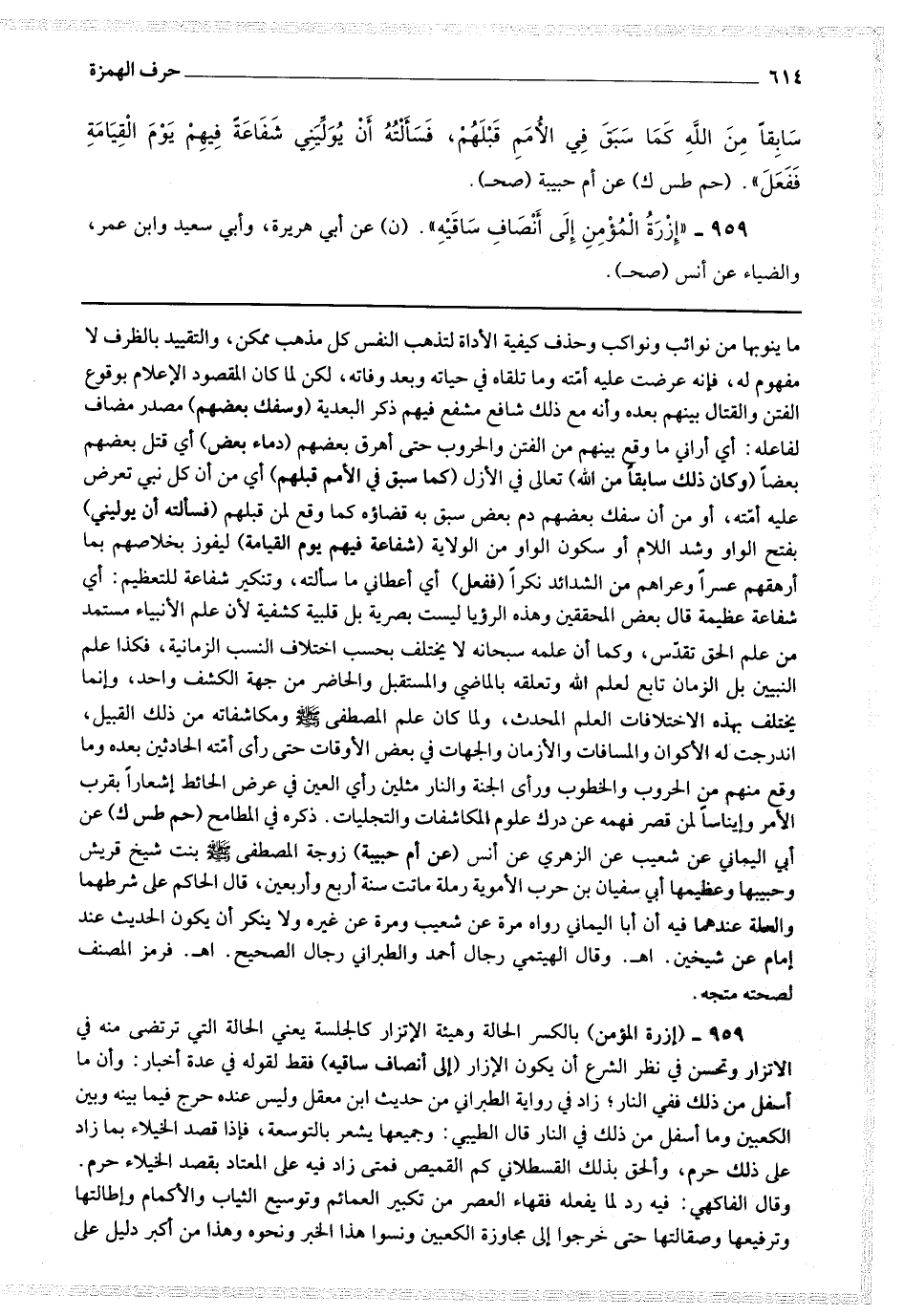 959 - (إزرة المؤمن) بالكسر الحالة وهيئة الانزار كالجلسة يعني الحالة التي ترتضي منه في الإتزار وتحسن في نظر الشرع أن يكون الإزار (إلى أنصاف ساقيه) فقط لقوله في عدة أخبار : وأن ما أسفل من ذلك ففي النار ، زاد في رواية الطبراني من حديث ابن معقل وليس عنده حرج فيما بينه وبين الكعبين وما أسفل من ذلك في النار قال الطيبي : وجميعها يشعر بالتوسعة ، فإذا قصد الخيلاء بما زاد على ذلك حرم ، وألحق بذلك القسطلاني كم القميص فمتى زاد فيه على المعتاد بقصد الخيلاء حرم.