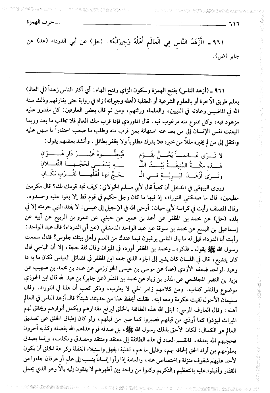 961 - (أزهد الناس) بفتح الهمزة وسكون الزاي وفتح الهاء : أي أكثر الناس زهدا (في العالم) بعلم طريق الآخرة أو بالعلوم الشرعية أو العقلية (أهله وجيرانه) زاد في رواية حق يفارقهم وذلك سنة الله في الماضين وعادته في النبيين ، والعلماء ورثتهم ، ومن ثم قال بعض العارفين : كل مقدور عليه مزهود فيه ، وكل ممنوع منه مرغوب فيه.