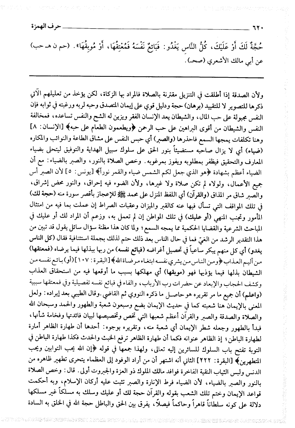 قال : وخص الصلاة بالنور والصبر بالضياء ، لأن فرط الانارة والصبر تثبت عليه أركان الإسلام ، وبه أحكمت قواعد الإيمان وختم تلك الشعب بقوله والقرآن حجة لك أو عليك وسلك به مسلكا غير مسلكها دلالة على كونه سلطانا قاهرا وحاكما فيصلا ، يفرق بين الحق والباطل حجة الله في الخلق به السادة