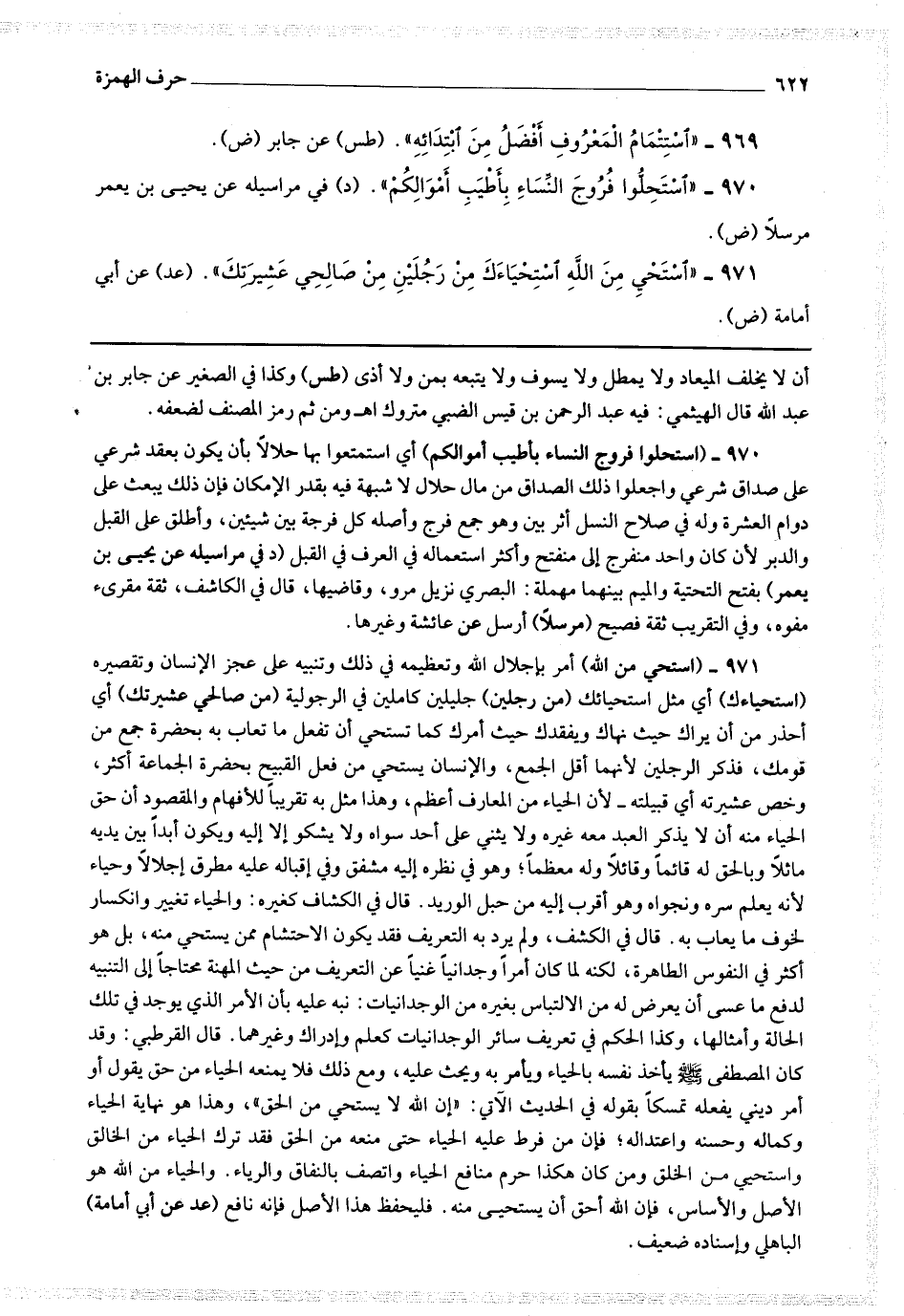 971 - (استحي من الله) أمر بإجلال الله وتعظيمه في ذلك وتنبيه على عجز الإنسان وتقصيره (استحياءك) أي مثل استحيائك (من رجلين) جليلين كاملين في الرجولية (من صالحي عشيرتك) أي احذر من أن يراك حيث نهاك ويفقدك حيث أمرك كما تستحي أن تفعل ما تعاب به بحضرة جمع من قومك ، فذكر الرجلين لأنهما أقل الجمع ، والإنسان يستحي من فعل القبيح بحضرة الجماعة أكثر ، وخص عشيرته أي قبيلته لأن الحياء من المعارف أعظم ، وهذا مثل به تقريبا للأفهام والمقصود أن حق الحياء منه أن لا يذكر العبد معه غيره ولا يثني على أحد سواه ولا يشكو إلا إليه ويكون أبدا بين يديه ماثلا وبالحق له قائما وقائلا وله معظما ، وهو في نظره إليه مشفق وفي إقباله عليه مطرق إجلالا وحياء لأنه يعلم سره ونجواه وهو أقرب إليه من حبل الوريد.