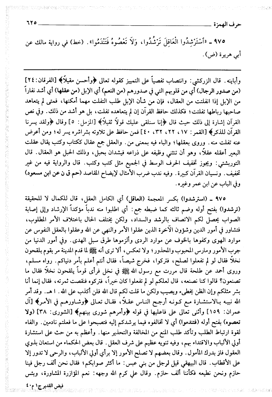 975 - (استرشدوا) بكسر المعجمة (العاقل) أي الكامل العقل ، قال للكمال لا للحقيقة (ترشدوا) بفتح أوله وضم ثالثه كما ضبطه جمع.