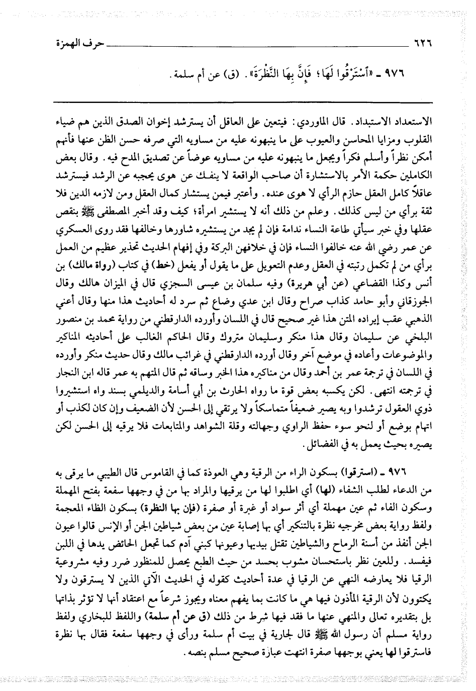 (ق عن أم سلمة) واللفظ للبخاري ولفظ رواية مسلم أن رسول الله صلى الله عليه وسلم قال لجارية في بيت أم سلمة ورأى في وجهها سفعة فقال بها نظرة فاسترقوا لها يعني بوجهها صفرة انتهت عبارة صحيح مسلم بنصه.