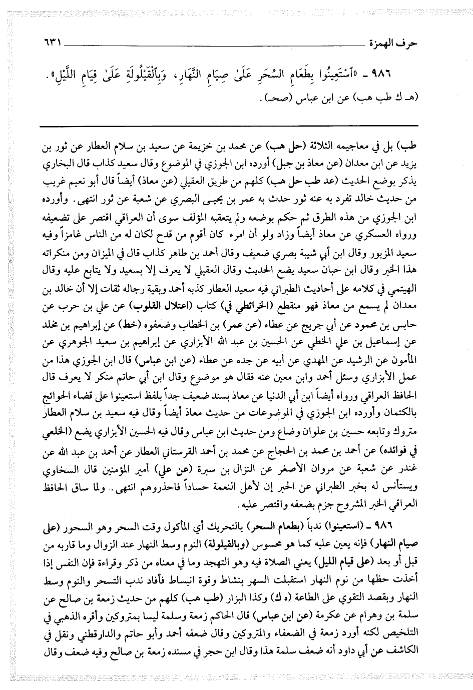986 - (استعينوا) ندبا (بطعام السحر) بالتحريك أي المأكول وق السحر وهو السحور (على صيام النهار) فإنه يعين عليه كما هو محسوس (وبالقيلولة) النوم وسط النهار عند الزوال وما قاربه من قبل أو بعد (على قيام الليل) يعني الصلاة فيه وهو التهجد وما في معناه من ذكر وقراءة فإن النفس إذا أخذت حظها من نوم النهار استقبلت السهر بنشاط وقوة انبساط فأفاد ندب التسحر والنوم وسط النهار وبقصد التقوى على الطاعة (ه ك) وكذا البزاز (طب هب) كلهم من حديث زمعة بن صالح عن سلمة بن وهرام عن عكرمة (عن ابن عباس) قال الحاكم زمعة وسلمة ليسا بمتروكين وأقره الذهبي في التلخيص لكنه أورد زمعة في الضعفاء والمتروكين وقال ضعفه أحمد وأبو حاتم والدارقطني ونقل في الكاشف عن أبي داود أنه ضعف سلمة هذا وقال ابن حجر في مسنده زمعة بن صالح وفيه ضعف وقال
