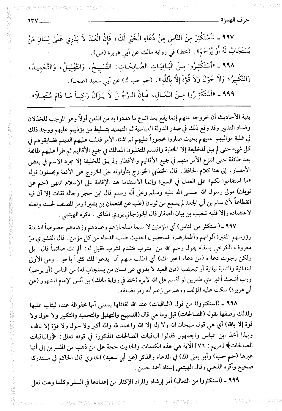 998 - (استكثروا من) قول (الباقيات) عند الله لقائلها بمعنى أنها محفوظة عنده ليثاب عليها ولذلك وصفها بقوله (الصالحات) قيل وما هي قال (التسبيح والتهليل والتحميد والتكبير ولا حول ولا قوة إلا بالله) أي هي قول سبحان الله ولا إله إلا الله والحمد لله والله أكبر ولا حول ولاقوة إلا بالله ،