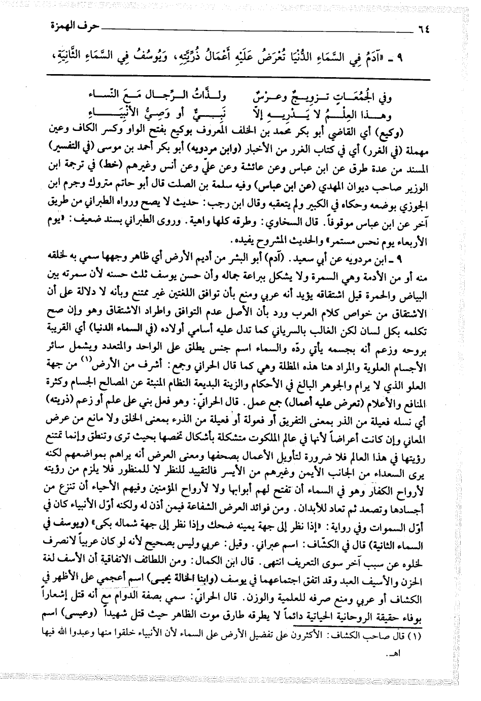 9 - (آدم) أبو البشر من أديم الأرض أي ظاهر وجهها سمي به لخلقه منه أو من الأدمة وهي السمرة ولا يشكل ببراعة جماله وأن حسن يوسف ثلث حسنه لأن سمرته بين البياض والحمرة قيل اشتقاقه يؤيد أنه عربي ومنع بأن توافق اللغتين غير ممتنع وبأنه لا دلالة على أن الاشتقاق من خواص كلام العرب ورد بأن الأصل عدم التوافق واطراد الاشتقاق وهو وإن صح تكلمه بكل لسان لكن الغالب بالسرياني كما تدل عليه أسامي أولاده (في السماء الدنيا) أي القريبة بروحه وزعم أنه بجسمه يأتي رده والسماء اسم جنس يطلق على الواحد والمتعدد ويشمل سائر الأجسام العلوية والمراد هنا هذه المظلة وهي كما قال الحراني وجمع : أشرف من الأرض (قال صاحب الكشف : الأكثرون على تفضيل الأرض على السماء لأن الأنبياء خلقوا منها وعبدوا الله فيها اه) من جهة العلو الذي لا يرام والجوهر البالغ في الأحكام والزينة البديعة النظام المنبثة عن المصالح الجسام وكثرة المنافع والأعلام (تعرض عليه أعمال) جمع عمل.