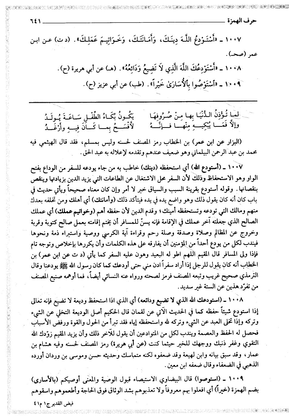 1007 - (أستودع الله) أي استحفظ (دينك) جاطب به من جاء يودعه للسفر من الوداع بفتح الواو وهو الاستحفاظ وذلك لأن السفر محل الاشتغال عن الطاعات التي يزيد الدين بزيادتها وينقص بنقصانها ، وقوله أستودع بقرينة السبب والسياق خبر لا أمر وإن كان معناه صحيحا ويأتي حديث في باب كان أنه كان يقول ذلك وهو واضع يده في يده فيتأكد ذلك (وأمانتك) أي أهلك ومن تخلفه بعدك منهم ومالك التي تودعه وتستحفظ أمينك ، وقدم الدين لأن حفظه أهم (وخواتيم عملك) أي عملك الصالح الذي جعلته آخر عملك في الإقامة فإنه يسن للمسافر أن يختم إقامته بعمل صالح كتوبة وقربة وخروج عن المظالم وصلاة وصدقة وصلة رحم وقراءة آية الكرسي ووصية واستبراء ذمة ونحوها فيندب لكل من يودع أحدا من المؤمنين أن يفارقه على هذه الكلمات وأن يكررها بإخلاص وتوجه تام فإذا ولى المسافر قال المقيم اللهم اطو له البعيد وهون عليه السفر كما يأتي (د ت عن ابن عمر) بن الخطاب أنه كان يقول للرجل إذا أراد سفرا ادن مني حتى أودعك كما كان رسول الله صلى الله عليه وسلم يودعنا وقال الترمذي صحيح غريب وتبعه المصنف فرمز لصحته ورواه عنه النسائي أيضا ، فما أوهمه صنيع المصنف من تفرد هذين عن الستة غير سديد.