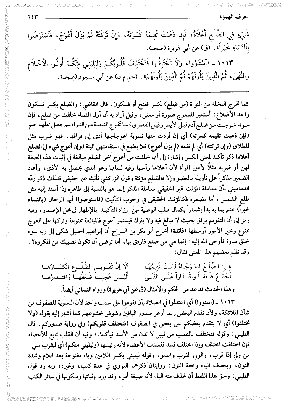 هي الضلع العوجاء لست تقيمها * ألا إن تقويم الضلوع انكسارها تجمع ضعفا واقتدارا على الفتى * أليس عجبا ضعفها واقتدارها وهذا الحديث قد عد من الحكم والأمثال (ق عن أبي هريرة) ورواه النسائي أيضا.