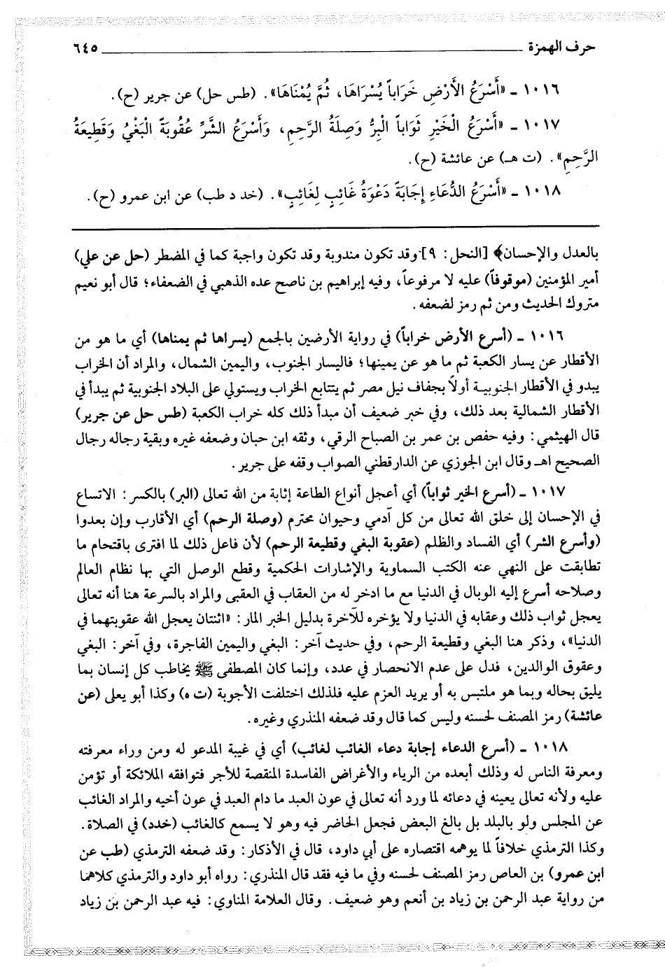 1017 - (أسرع الخير ثوابا) أي أعجل أنواع الطاعة إثابة من الله تعالى (البر) بالكسر : الاتساع في الإحسان إلى خلق الله تعالى من كل آدمي وحيوان محترم (وصلة الرحم) أي الأقارب وإن بعدوا (وأسرع الشر) أي الفساد والظلم (عقوبة البغي وقطيعة الرحم) لأن فاعل ذلك لما افترى باقتحام ما تطابقت على النهي عنه الكتب السماوية والإشارات الحكمية وقطع الوصل التي بها نظام العالم وصلاحه أسرع إليه الوبال في الدنيا مع ما ادخر له من العقاب في العقبى والمراد بالسرعة هنا أنه تعالى يعجل ثواب ذلك وعقابه في الدنيا ولا يؤخره للآخرة بدليل الخبر المار : اثنان يعجل الله عقوبتهما في الدنيا ، وذكر هنا البغي وقطيعة الرحم ، وفي حديث آخر : البغي واليمين الفاجرة ، وفي آخر : البغي وعقوق الوالدين ، فدل على عدم الانحصار في عدد ، وإنما كان المصطفى صلى الله عليه وسلم يخاطب كل إنسان بما يليق بحاله وبما هو ملتبس به أو يريد العزم عليه فلذلك اختلفت الأجوبة.