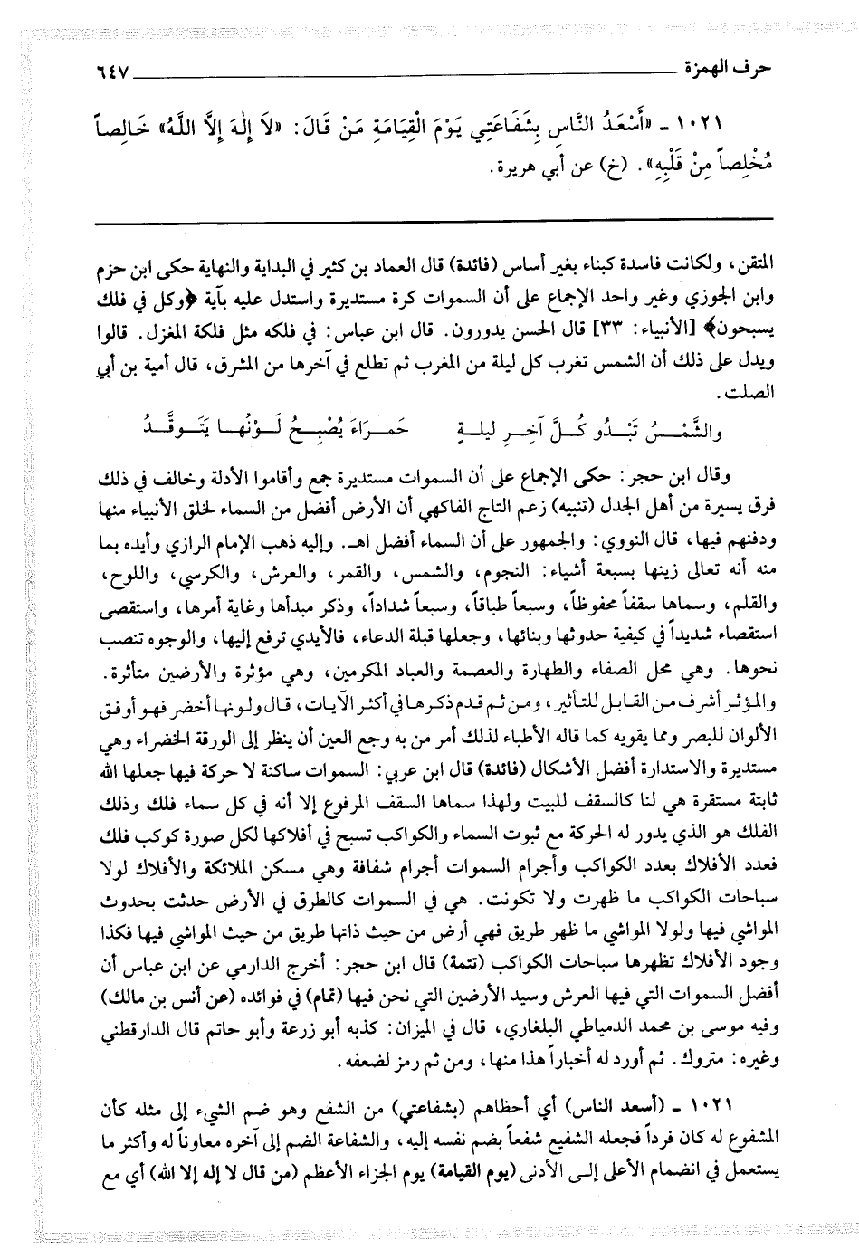 قالوا ويدل على ذلك أن الشمس تغرب كل ليلة من المغرب ثم تطلع في آخرها من المشرق ، قال أمية بن أبي الصلت : والشمس تبدو كل آخر ليلة * حمراء يصبح لونها يتوقد وقال ابن حجر : حكى الإجماع على أن السماوات مستديرة جمع وأقاموا الأدلة وخالف في ذلك فرق يسيرة من أهل الجدل (تنبيه) زعم التاج الفاكهي أن الأرض أفضل من السماء لخلق الأنبياء منها ودفنهم فيها ، قال النووي : والجمهور على أن السماء أفضل اه.