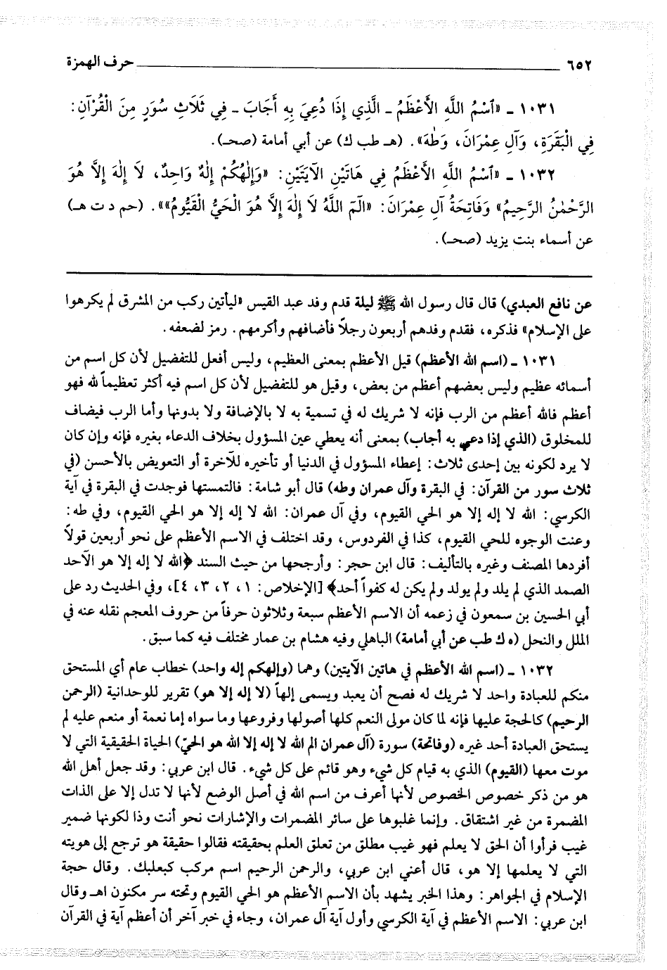 1032 - (اسم الله الأعظم في هاتين الآيتين) وهما (وإلهكم إله واحد) خطاب عام أي المستحق منكم للعبادة واحد لا شريك له فصح أن يعبد ويسمى إلها (لا إله إلا هو) تقرير للوحدانية (الرحمن الرحيم) كالحجة عليها فإنه لما كان مولى النعم كلها أصولها وفروعها وما سواه إما نعمة أو منعم عليه لم يستحق العبادة أحد غيره (وفاتحة) سورة (آل عمران الم الله لا إله إلا هو الحي) الحياة الحقيقية التي لا موت معها (القيوم) الذي به قيام كل شئ وهو قائم على كل شئ.