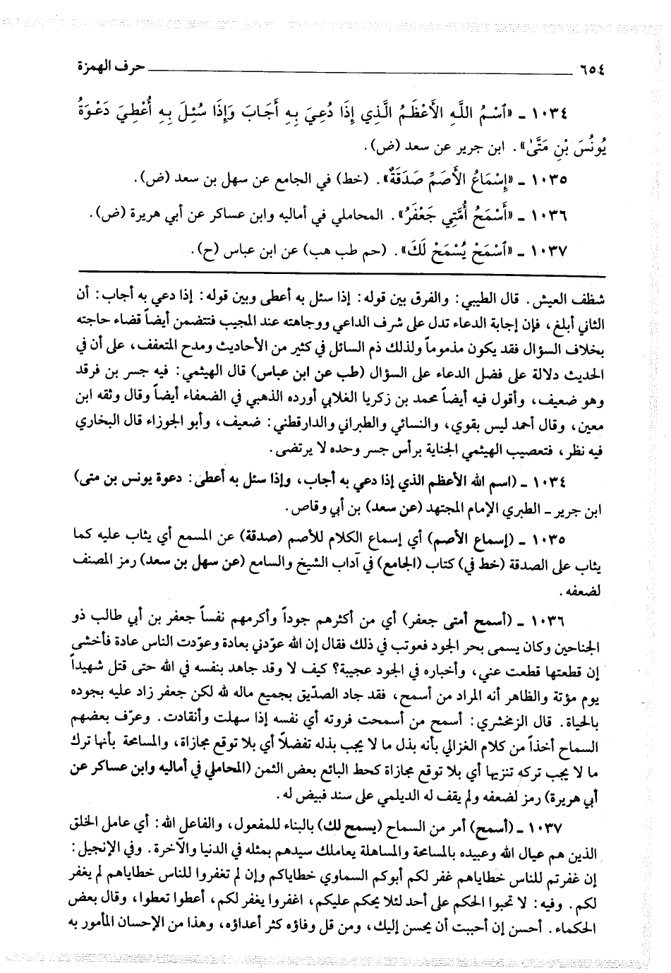 1036 - (أسمح أمتي جعفر) أي من أكثرهم جودا وأكرمهم نفسا جعفر بن أبي طالب ذو الجناحين وكان يسمى بحر الجود فعوتب في ذلك فقال إن الله عودني بعادة وعودت الناس عادة فأخشى إن قطعتها قطعت عني ، وأخباره في الجود عجيبة ؟ كيف لا وقد جاهد بنفسه في الله حتى قتل شهيدا يوم مؤتة والظاهر أنه المراد من أسمح ، فقد جاد الصديق بجميع ماله لله لكن جعفر زاد عليه بجوده بالحياة.