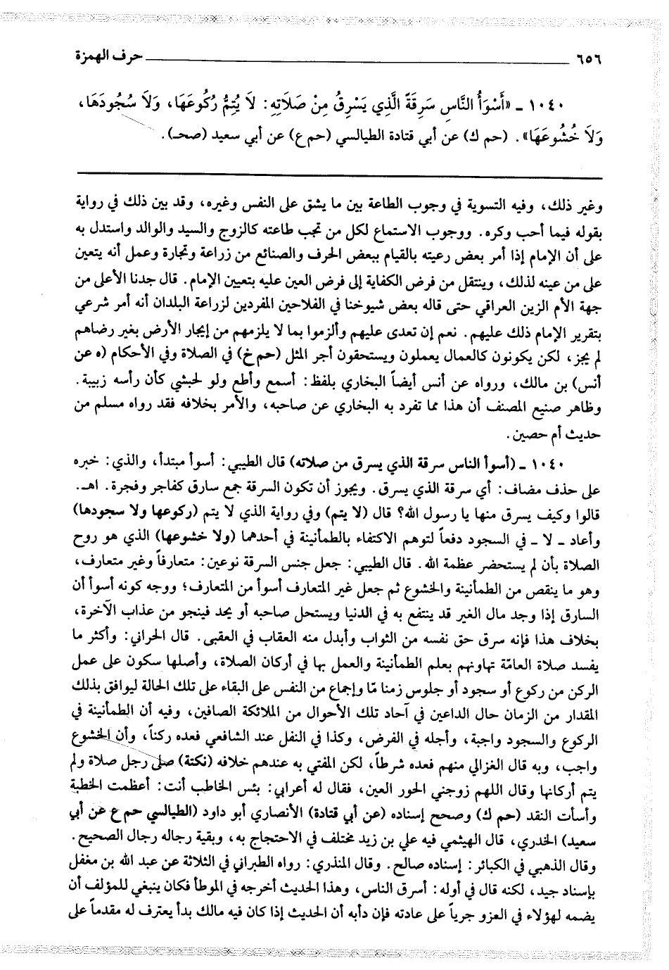 1040 - (أسوأ الناس سرقة الذي يسرق من صلاته) قال الطيبي : أسوأ مبتدأ ، والذي : خبره