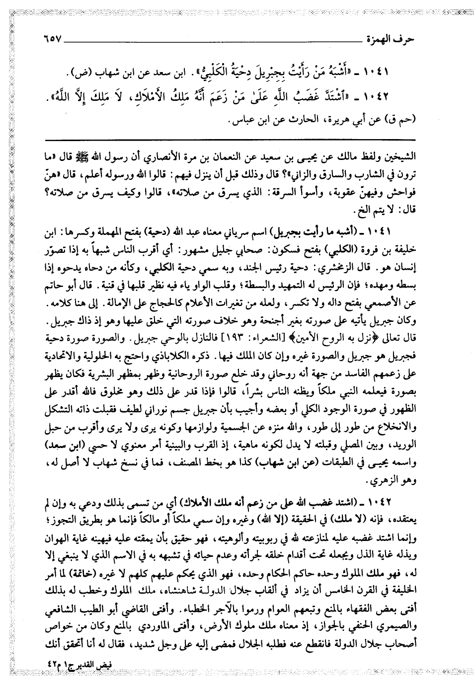 1041 - (أشبه ما رأيت بجبريل) اسم سرياني معناه عبد الله (دحية) بفتح المهملة وكسرها : ابن خليفة بن فروة (الكلبي) بفتح فسكون : صحابي جليل مشهور أي أقرب الناس شبها إذا تصور بصورة إنسان هو.