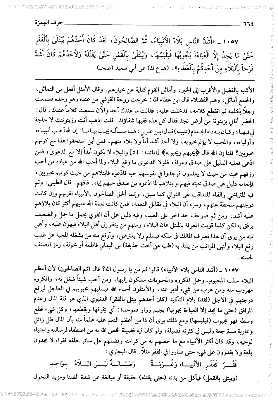 1057 - (أشد الناس بلاء الأنبياء) قالوا ثم من يا رسول الله ؟ قال (ثم الصالحون) لأن أعظم البلاء سلب المحبوب وحمل المكروه والمحبوبات مسكون إليها ، ومن أحب شيئا شغل به ، والمكروه مهروب منه ومن هرب من شئ أدبر عنه ، والأمثلون أحباء الله فيسلبهم محبوبهم في العاجل ليرفع درجتهم في الأجل (لقد) بلام التأكيد (كان أحدهم يبتلى بالفقر) الدنيوي الذي هو قلة المال وعدم المرافق (حتى ما يجد إلا العباءة يجوبها) بجيم وواو فموحدة : أي يخرقها ويقطعها ، وكل شئ قطع وسطه فهو مجبوب (فيلبسها) ومع ذلك يرى أن ذا من أعظم النعم عليه علما منه بأن المال ظل زائل وعارية مسترجعة وليس في كثرته فضيلة ، ولو كان فيه فضيلة لخص الله به من اصطفاه لرسالته واجتباه لوحيه ، وقد كان أكثر الأنبياء مع ما خصهم به من كرامته وفضلهم على سائر خلقه فقراء لا يجدون بلغة ولا يقدرون على شئ حتى صاروا في الفقر مثلا.