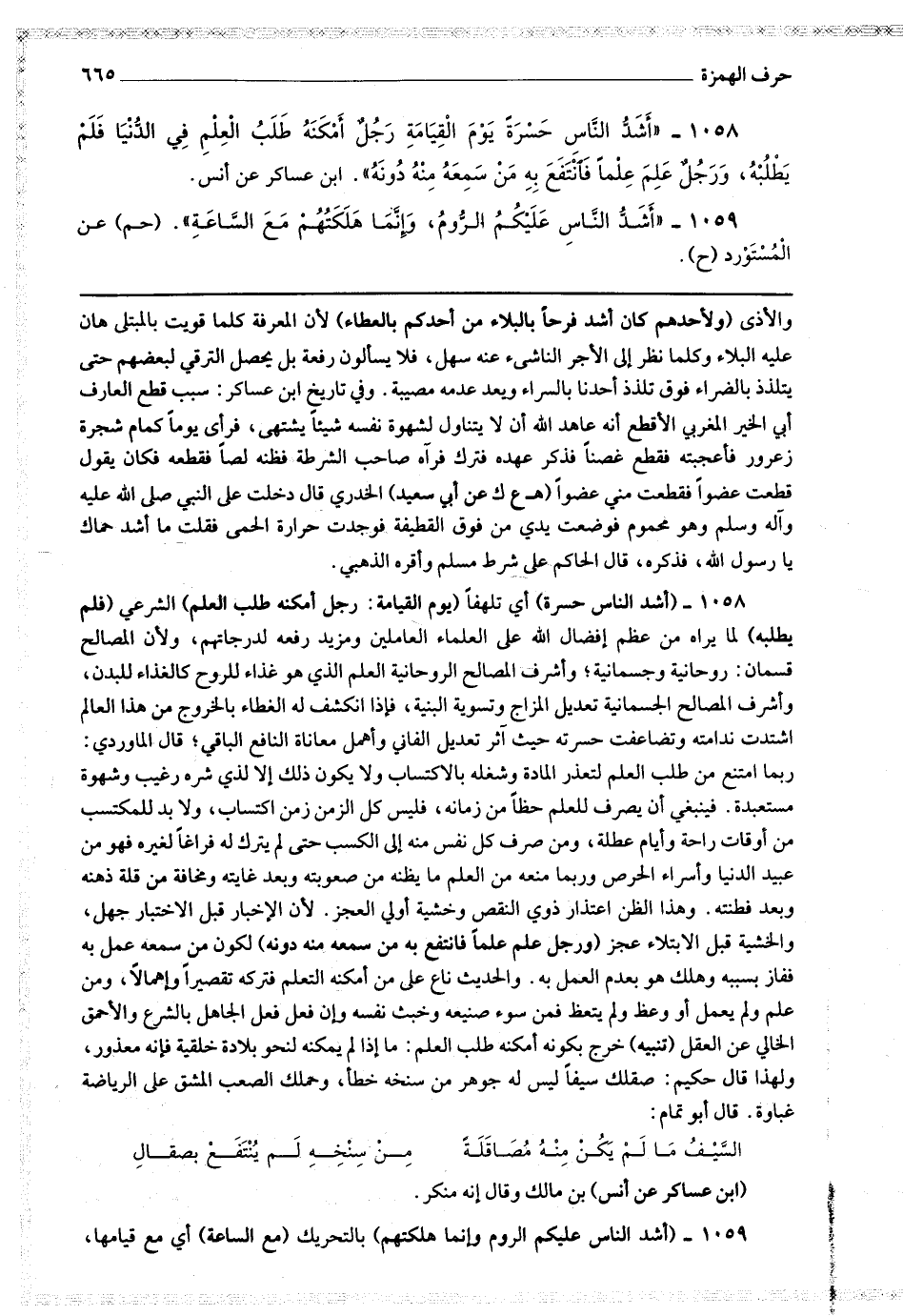 1058 - (أشد الناس حسرة) أي تلهفا (يوم القيامة : رجل أمكنه طلب العلم) الشرعي (فلم يطلبه) لما يراه من عظم إفضال الله على العلماء العاملين ومزيد رفعه لدرجاتهم ، ولأن المصالح قسمان : روحانية وجسمانية ، وأشرف المصالح الروحانية العلم الذي هو غذاء للروح كالغذاء للبدن ، وأشرف المصالح الجسمانية تعديل المزاج وتسوية البنية ، فإذا انكشف له الغطاء بالخروج من هذا العالم اشتدت ندامته وتضاعفت حسرته حيث آثر تعديل الفاني وأهمل معاناة النافع الباقي ، قال الماوردي : ربما امتنع من طلب العلم لتعذر المادة وشغله بالاكتساب ولا يكون ذلك إلا لذي شره رغيب وشهوة مستعبدة.