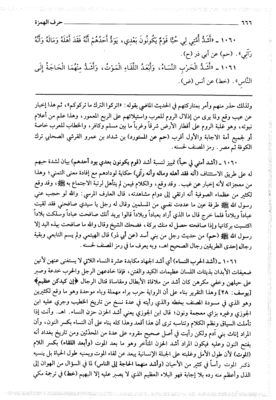 1061 - (أشد الحرب النساء) أي أشد الجهاد مكابدة عشرة النساء اللاتي لا يستغنى عنهن لأنهن ضعيفات الأبدان بذيئات اللسان عظيمات الكيد والفتن ، فإذا خادعهن الرجل والحرب خدعة وصبر على حيلهن وخفي مكرهن كان أشد من ملاقاة الأبطال ومقاساة قتال الرجال * (إن كيدكن عظيم) * وهذا التقرير بناء على أن الرواية حرب براء مهملة وباء موحدة وهو ما وقع لكثيرين وهو الذي في مسودة المصنف بخطه والذي رأيته في عدة نسخ من تاريخ الخطيب وجرى عليه ابن الجوزي وغيره بزاي معجمة ونون ، قال ابن الجوزي يعني أشد الحزن حزن النساء.