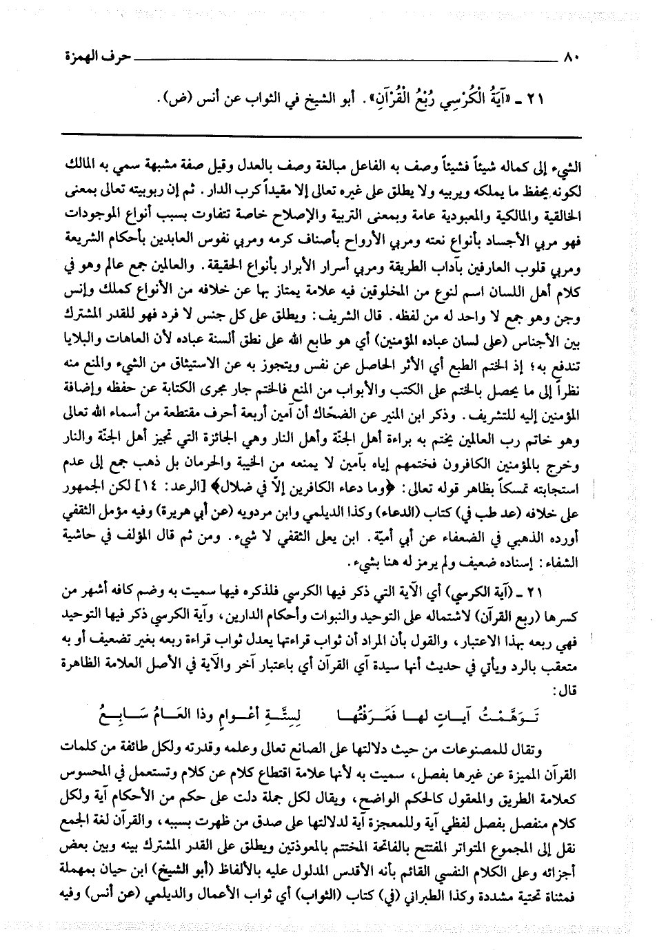 ومن ثم قال المؤلف في حاشية الشفاء : إسناده ضعيف ولم يرمز له هنا بشئ 21 - (آية الكرسي) أي الآية التي ذكر فيها الكرسي فلذكره فيها سميت به وضم كافه أشهر من كسرها (ربع القرآن) لاشتماله على التوحيد والنبوات وأحكام الدارين ، وآية الكرسي ذكر فيها التوحيد فهي ربعه بهذا الاعتبار ، والقول بأن المراد أن ثواب قراءتها يعدل ثواب قراءة ربعه بغير تضعيف أو به متعقب بالرد ويأتي في حديث أنها سيدة آي القرآن أي باعتبار آخر والآية في الأصل العلامة الظاهرة قال : توهمت آيات لها فعرفتها لستة أعوام وذا العام سابع وتقال للمصنوعات من حيث دلالتها على الصانع تعالى وعلمه وقدرته ولكل طائفة من كلمات القرآن المميزة عن غيرها بفصل.