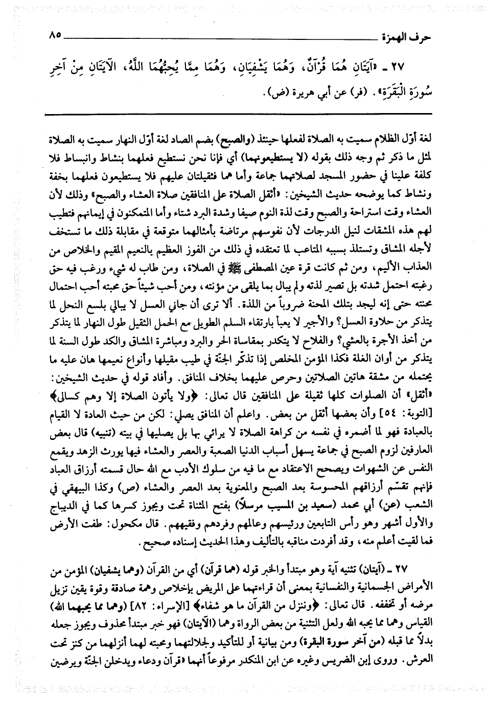 27 - (آيتان) تثنية آية وهو مبتدأ والخبر قوله (هما قرآن) أي من القرآن (وهما يشفيان) المؤمن من الأمراض الجسمانية والنفسانية بمعنى أن قراءتهما على المريض بإخلاص وهمة صادقة وقوة يقين تزيل مرضه أو تخففه.