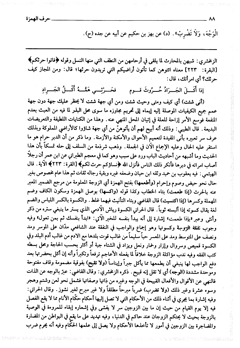 الزمخشري : شبهن بالمحارث لما يلقى في أرحامهن من النطف التي منها النسل وقوله * (فأتوا حرثكم) * معناه ائتوهن كما تأتون أراضيكم التي تريدون حرثها ؟ قال : ومن المجاز كيف حرثك ؟ أي امرأتك ، قال : إذا أكل الجراد حروث قوم