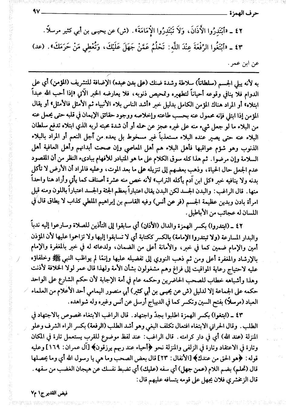 42 - (إبتدروا) بكسر الهمزة والدال (الأذان) أي سابقوا إلى التأذين للصلاة وسارعوا إليه ندبا والبدار المسارعة (ولا تبتدروا الإمامة) بالكسر ككتابة أي لا تسابقوا إليها ولا تزاحموا عليها لأن المؤذن أمين والإمام ضمين كما في خبر ، والإمامة أعلى من الضمان ، ولدعائه له في خبر بالمغفرة والامام بالإرشاد والمفغرة أعلى ومن ثم ذهب النووي إلى تفضيله عليها وإنما لم يواظب النبي صلى الله عليه وسلم وخلفاؤه عليه لاحتياج رعاية المواقيت إلى فراغ وهو مشغولون بشأن الأمة ولهذا قال عمر لولا الخلافة لأذنت وهذا وأشباهه خطاب للصحب الحاضرين وحكمه عام في أمة الإجابة لأن حكم الشارع على الواحد حكمه على الجماعة إلا لدليل (ش عن يحيى بن أبي كثير) أبي منصور اليمامي أحد الأعلام من العلماء العباد (مرسلا) بفتح السين وتكسر كما في الديباج أرسل عن أنس وغيره وله شواهد.