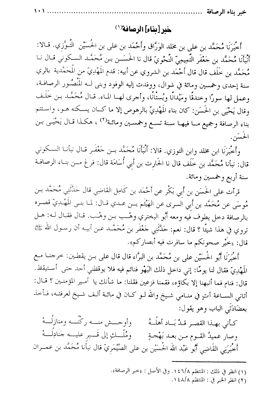 [1] انظر في ذلك: المنتظم 8/146. وفي الأصل: «خبر الرصافة» .