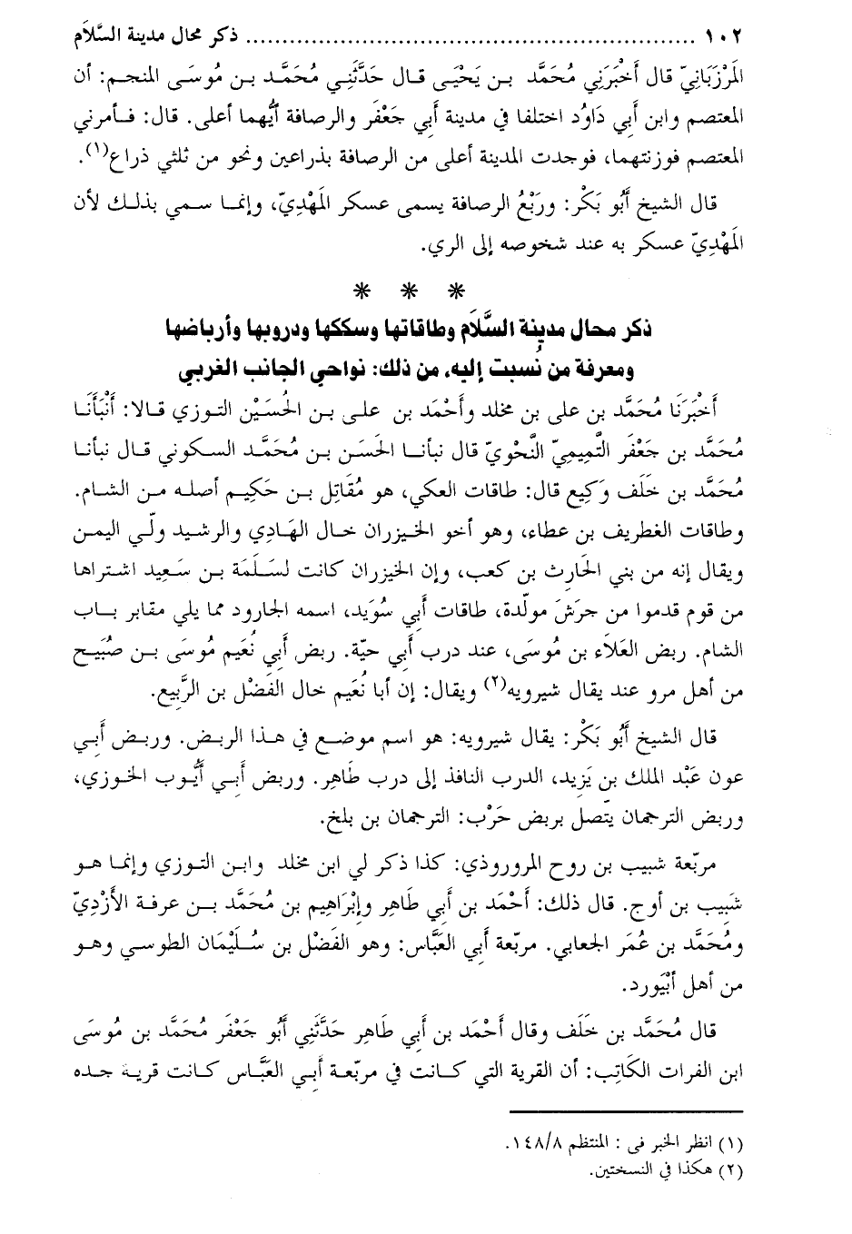 المَرْزُباني قَالَ أَخْبَرَنِي مُحَمَّد بن يَحْيَى قَالَ حَدَّثَنِي مُحَمَّد بْن مُوسَى المنجم: أن المعتصم وابن أبي داود اختلفا في مدينة أبي جعفر والرصافة أيّهما أعلى. قَالَ: فأمرني المعتصم فوزنتهما، فوجدت المدينة أعلى من الرصافة بذراعين ونحو من ثلثي ذراع [1] .