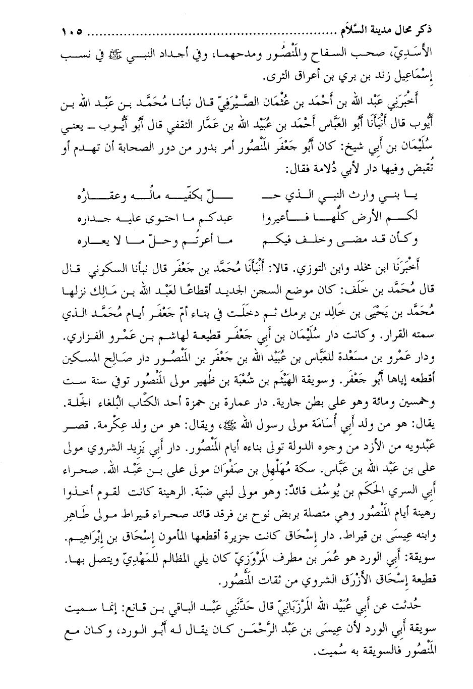 يقال: هو من ولد أبي أسامة مَوْلَى رَسُولِ اللَّهِ صَلَّى اللَّهُ عَلَيْهِ وَسَلَّمَ، ويقال: هو من ولد عكرمة. قصر عبدويه من الأزد من وجوه الدولة تولى بناءه أيام المنصور. دار أَبِي يزيد الشروي مولى عَلِيّ بْن عَبْدِ اللَّهِ بْن عباس. سكة مهلهل بْن صفوان مولى عَلِيّ بْن عَبْدِ اللَّهِ. صحراء أَبِي السري الحكم بْن يوسف قائد: وهو مولى لبني ضبة. الرهينة كانت لقوم أخذوا رهينة أيام المنصور وهي متصلة بربض نوح بْن فرقد قائد صحراء قيراط مولى طاهر وابنه عِيسَى بْن قيراط. دار إسحاق كانت جزيرة أقطعها المأمون إسحاق بْن إِبْرَاهِيمَ.