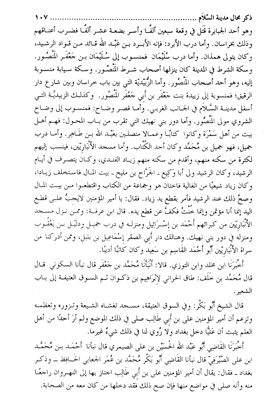 وسكة الشرط في المدينة كان ينزلها أصحاب شرط المنصور. وسكة سيابة منسوبة إليه، وهو أحد أصحاب المنصور. وأما الزبيدية التي بين باب خراسان وبين شارع دار الرقيق؛ فمنسوبة إِلَى زبيدة بنت جعفر بْن أَبِي جعفر المنصور. وكذلك الزبيدية التي أسفل مدينة السلام في الجانب الغربي. وأما قصر وضاح: فمنسوب إِلَى وضاح الشروي مولى المنصور. وأما دور بني نهيك التي تقرب من باب المحول: فهم أهل بيت من أهل سمرة وكانوا كتابا وعمالا متصلين بعبد الله بْن طاهر. وأما درب جميل، فهو جميل بْن مُحَمَّد وكان أحد الكتاب. وأما مسجد الأنباريين، فينسب إليهم لكثرة من سكنه منهم، وأقدم من سكنه منهم زياد القندي، وكان يتصرف في أيام الرشيد، وكان الرشيد ولى أبا وكيع- الجراح بْن مليح- بيت المال فاستخلف زيادا، وكان زياد شيعيا من الغالية فاختان هو وجماعة من الكتاب واقتطعوا من بيت المال وصح ذلك عند الرشيد فأمر بقطع يد زياد. فقال: يا أمير المؤمنين لا يجب عَلِيّ قطع اليد إنما أنا مؤتمن وإنما خنت فكف عَنْ قطع يده. قَالَ ابْن عرفة: وممن نزل مسجد الأنباريين من كبرائهم أَحْمَد بْن إسرائيل ومنزله في درب جميل ودليل بْن يعقوب ومنزله في دور بني نهيك. وهنالك دار أَبِي الصقر إسماعيل بْن بلبل، وممن أدركنا من سراة الأنباريين أَبُو أَحْمَد القاسم بْن سعيد وكان كاتبا أديبا.