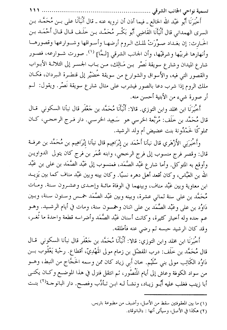 أَخْبَرَنَا ابْن مخلد وابن التوزي: قالا: أَنْبَأَنَا مُحَمَّد بْنُ جَعْفَرٍ قَالَ نبأنا السكوني قَالَ قَالَ مُحَمَّد بْن خلف: درب المفضل بْن زمام مولى المهدي، إقطاع. رحبة يعقوب بْن داود الكاتب مولى بني سليم. خان أبي زياد كان ممن وسمه الحجاج من النبط، وهو من سواد الكوفة وعاش إِلَى أيام المنصور، ثم انتقل فنزل في هذا الموضع وكان يكنى أبا زينب فغلب عليه أَبُو زياد، ونشأ له ابْن تأدّب وفصح. دار البانوجة [2] بنت
