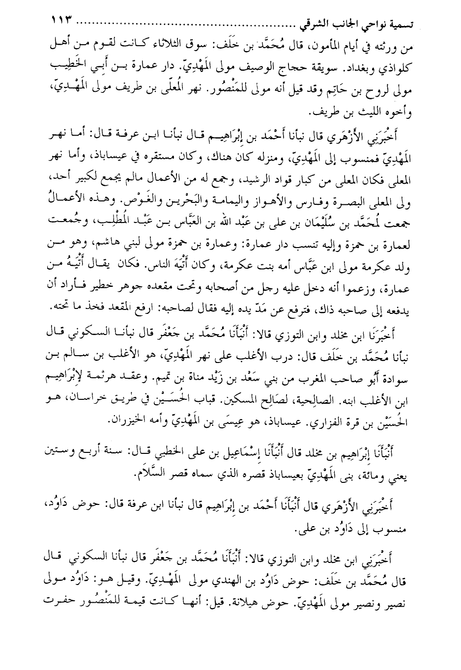 أَخْبَرَنِي الأزهري قال نبأنا أحمد بن إبراهيم قال نبأنا ابن عرفة قَالَ: أما نهر المهدي فمنسوب إِلَى المهديّ، ومنزله كان هناك، وكان مستقره في عيساباذ، وأما نهر المعلى فكان المعلى من كبار قواد الرشيد، وجمع له من الأعمال ما لم يجمع لكبير أحد، ولي المعلى البصرة وفارس والأهواز واليمامة والبحرين والغوص. وهذه الأعمال جمعت لمحمد بْن سُلَيْمَان بْن عَلِيّ بْن عَبْد اللَّه بْن الْعَبَّاسِ بْن عَبْد المطلب، وجمعت لعمارة بْن حمزة وإليه تنسب دار عمارة: وعمارة بْن حمزة مولى لبني هاشم، وهو من ولد عكرمة مولى ابْن عباس أمه بنت عكرمة، وكان أتيه الناس. فكان يقال أتيه من عمارة، وزعموا أنه دخل عليه رجل من أصحابه وتحت مقعده جوهر خطير فأراد أن يدفعه إِلَى صاحبه ذاك، فترفع عَنْ مد يده إليه فقال لصاحبه: ارفع المقعد فخذ ما تحته.