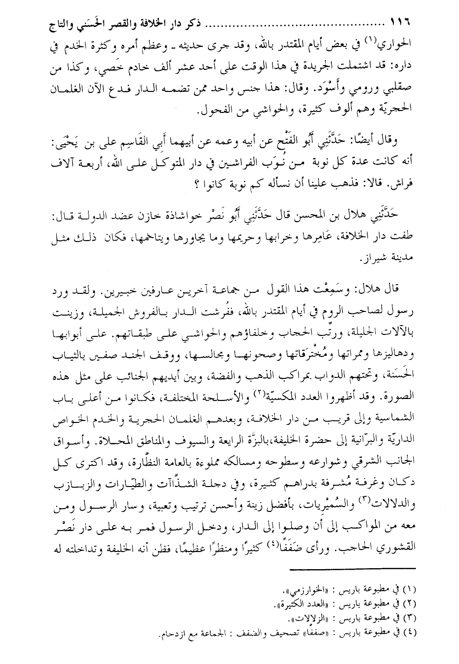 قَالَ هلال: وسمعت هذا القول من جماعة آخرين عارفين خبيرين. ولقد ورد رسول لصاحب الروم في أيام المقتدر بالله، ففرشت الدار بالفروش الجميلة، وزينت بالآلات الجليلة، ورتب الحجاب وخلفاؤهم والحواشي على طبقاتهم. على أبوابها ودهاليزها وممراتها ومخترقاتها وصحونها ومجالسها، ووقف الجند صفين بالثياب الحسنة، وتحتهم الدواب بمراكب الذهب والفضة، وبين أيديهم الجنائب على مثل هذه الصورة. وقد أظهروا العدد المكسيّة [2] والأسلحة المختلفة، فكانوا من أعلى باب الشماسية وإلى قريب من دار الخلافة، وبعدهم الغلمان الحجرية والخدم الخواص الدارية والبرانية إِلَى حضرة الخليفة، بالبزّة الرائعة والسيوف والمناطق المحلاة. وأسواق الجانب الشرقي وشوارعه وسطوحه ومسالكه مملوءة بالعامة النظارة، وقد اكتري كل دكان وغرفة مشرفة بدراهم كثيرة، وفي دجلة الشذّاآت والطيّارات والزبازب والدلالات [3] والسميريات، بأفضل زينة وأحسن ترتيب وتعبية، وسار الرسول ومن معه من المواكب إِلَى أن وصلوا إِلَى الدار، ودخل الرسول فمر به على دار نصر القشوري الحاجب. ورأى ضففا [4] كثيرا ومنظرا عظيما، فظن أنه الخليفة وتداخلته له
