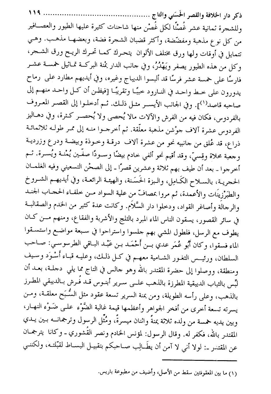 وللشجرة ثمانية عشر غصنا لكل غصن منها شاحنات كثيرة عليها الطيور والعصافير من كل نوع مذهبة ومفضضة، وأكثر قضبان الشجرة فضة، وبعضها مذهب. وهي تتمايل في أوقات ولها ورق مختلف الألوان يتحرك كما تحرك الريح ورق الشجر، وكل من هذه الطيور يصفر ويهدر، وفي جانب الدار بمنة البركة تماثيل خمسة عشر فارسا على خمسة عشر فرسا قد ألبسوا الديباج وغيره، وفي أيديهم مطارد على رماح يدورون على خط واحد في النارود خببا وتقريبا [فيظن أن كل واحد منهم إِلَى صاحبه قاصد [1]] . وفي الجانب الأيسر مثل ذلك. ثم أدخلوا إِلَى القصر المعروف بالفردوس، فكان فيه من الفرش والآلات ما لا يحصى ولا يحصر كثرة، وفي دهاليز الفردوس عشرة آلاف جوشن مذهبة معلقة. ثم أخرجوا منه إلى ممر طوله ثلاثمائة ذراع، قد علق من جانبيه نحو من عشرة آلاف درقة وخوذة وبيضة ودرع وزردية وجعبة محلاة وقسي، وقد أقيم نحو ألفي خادم بيضا وسودا صفين يمنة ويسره. ثم أخرجوا- بعد أن طيف بهم ثلاثة وعشرين قصرا- إِلَى الصحن التسعيني وفيه الغلمان الحجرية، بالسلاح الكامل، والبزة الحسنة، والهيئة الرائعة، وفي أيديهم الشروخ والطبرزينات والأعمدة، ثم مروا بمصاف من علية السواد من خلفاء الحجاب الجند والرجالة وأصاغر القواد، ودخلوا دار السلام. وكانت عدة كثير من الخدم والصقالبة في سائر القصور، يسقون الناس الماء المبرد بالثلج والأشربة والفقاع، ومنهم من كان يطوف مع الرسل، فلطول المشي بهم جلسوا واستراحوا في سبعة مواضع واستسقوا الماء فسقوا، وكان أَبُو عُمَر عدي بْن أَحْمَد بْن عَبْد الباقي الطرسوسي: صاحب السلطان، ورئيس الثغور الشامية معهم في كل ذلك، وعليه قباء أسود وسيف ومنطقة، ووصلوا إِلَى حضرة المقتدر بالله وهو جالس في التاج مما يلي دجلة، بعد أن لبس بالثياب الديبقية المطرزة بالذهب على سرير آبنوس قد فرش بالديبقي المطرز بالذهب، وعلى رأسه الطويلة، ومن يمنة السرير تسعة عقود مثل السبح معلقة، ومن يسرته تسعة أخرى من أفخر الجواهر وأعظمها قيمة غالبة الضوء على ضوء النهار، وبين يديه خمسة من ولده ثلاثة يمنة واثنان ميسرة، ومثل الرسول وترجمانه بين يدي المقتدر بالله، فكفر له. وقال الرسول: لمونس الخادم ونصر القشوري- وكانا يترجمان عَنِ المقتدر-: لولا أني لا آمن أن يطالب صاحبكم بتقبيل البساط لقبّلته، ولكنني