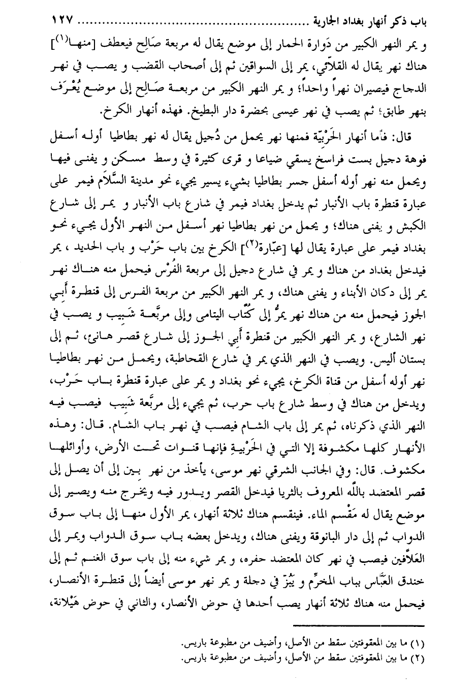 قَالَ: فأما أنهار الحربية فمنها نهر يحمل من دجيل يقال له نهر بطاطيا أوله أسفل فوهة دجيل بست فراسخ يسقي ضياعا وقرى كثيرة في وسط مسكن ويفنى فيها ويحمل منه نهر أوله أسفل جسر بطاطيا بشيء يسير يجيء نحو مدينة السلام فيمر على عبارة قنطرة باب الأنبار ثم يدخل بغداد فيمر في شارع باب الأنبار ويمر إِلَى شارع الكبش ويفنى هناك؛ ويحمل من نهر بطاطيا نهر أسفل من النهر الأول يجيء نحو بغداد فيمر على عبارة يقال لها [عبارة [2]] الكرخ بين باب حرب وباب الحديد، يمر فيدخل بغداد من هناك ويمر في شارع دجيل إِلَى مربعة الفرس فيحمل منه هناك نهر يمر إِلَى دكان الأبناء ويفنى هناك، ويمر النهر الكبير من مربعة الفرس إِلَى قنطرة أبي الجوز فيحمل منه من هناك نهر يمر إِلَى كتاب اليتامى وإلى مربعة شبيب ويصب في نهر الشارع، ويمر النهر الكبير من قنطرة أبي الجوز إِلَى شارع قصر هانئ، ثم إِلَى بستان أليس. ويصب في النهر الذي يمر في شارع القحاطبة، ويحمل من نهر بطاطيا نهر أوله أسفل من قناة الكرخ، يجيء نحو بغداد ويمر على عبارة قنطرة باب حرب، ويدخل من هناك في وسط شارع باب حرب، ثم يجيء إِلَى مربعة شبيب فيصب فيه النهر الذي ذكرناه، ثم يمر إِلَى باب الشام فيصب في نهر باب الشام. قَالَ: وهذه الأنهار كلها مكشوفة إلا التي في الحربية فإنها قنوات تحت الأرض، وأوائلها مكشوف. قَالَ: وفي الجانب الشرقي نهر مُوسَى، يأخذ من نهر بين إِلَى أن يصل إِلَى قصر المعتضد بالله المعروف بالثريا فيدخل القصر ويدور فيه ويخرج منه ويصير إِلَى موضع يقال له مقسم الماء. فينقسم هناك ثلاثة أنهار، يمر الأول منها إِلَى باب سوق الدواب ثم إلى دار البانوقة ويفنى هناك، ويدخل بعضه باب سوق الدواب ويمر إِلَى العلافين فيصب في نهر كان المعتضد حفره، ويمر شيء منه إِلَى باب سوق الغنم ثم إِلَى خندق العباس بباب المخرم ويبز في دجلة ويمر نهر مُوسَى أيضا إِلَى قنطرة الأنصار، فيحمل منه هناك ثلاثة أنهار يصب أحدها في حوض الأنصار، والثاني في حوض هيلانة،
