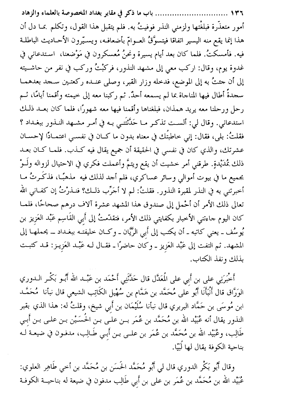 فقلت: بلى، فقال: إني خاطبتك في معناه بدون ما كان في نفسي اعتمادا لإحسان عشرتك، والذي كان في نفسي في الحقيقة أن جميع يقال فيه كذب. فلما كان بعد ذلك بمديدة. طرقني أمر خشيت أن يقع ويتم وأعملت فكري في الاحتيال لزواله ولو بجميع ما في بيوت أموالي وسائر عساكري، فلم أجد لذلك فيه مذهبا، فذكرت ما أخبرتني به في النذر لمقبرة النذور. فقلت: لم لا أجرب ذلك؟ فنذرت إن كفاني الله تعالى ذلك الأمر أن أحمل إِلَى صندوق هذا المشهد عشرة آلاف درهم صحاحا، فلما كان اليوم جاءتني الأخبار بكفايتي ذلك الأمر، فتقدمت إِلَى أَبِي القاسم عَبْد العزيز بْن يوسف- يَعْنِي كاتبه- أن يكتب إلى أبي الرّيّان- وكان خليفته ببغداد- يحملها إِلَى المشهد. ثم التفت إِلَى عَبْد العزيز- وكان حاضرا- فقال له عَبْد العزيز: قد كتبت بذلك ونفذ الكتاب.