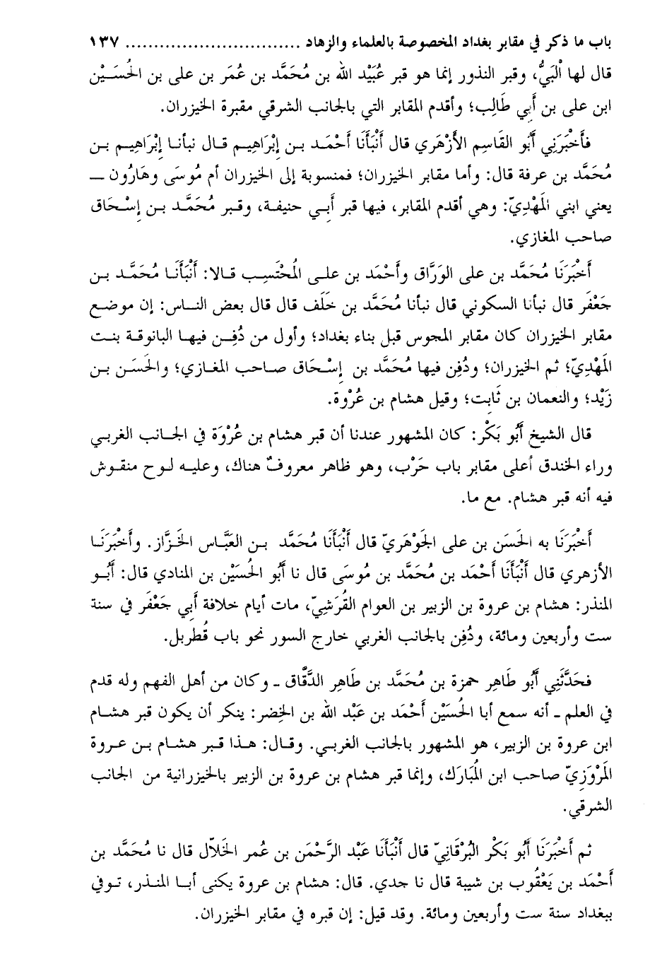 أَخْبَرَنَا به الْحَسَن بْن عَلِيّ الجوهري قال أنبأنا محمّد بن العبّاس الخزّاز. وأخبرنا الأزهري قَالَ أنبانا أَحْمَد بْن مُحَمَّد بْن موسى قال نا أَبُو الحسين بْن المنادي قَالَ: أَبُو المنذر: هشام بْن عروة بْن الزبير بْن العوام القرشي، مات أيام خلافة أَبِي جعفر في سنة ست وأربعين ومائة، ودفن بالجانب الغربي خارج السور نحو باب قطربل.