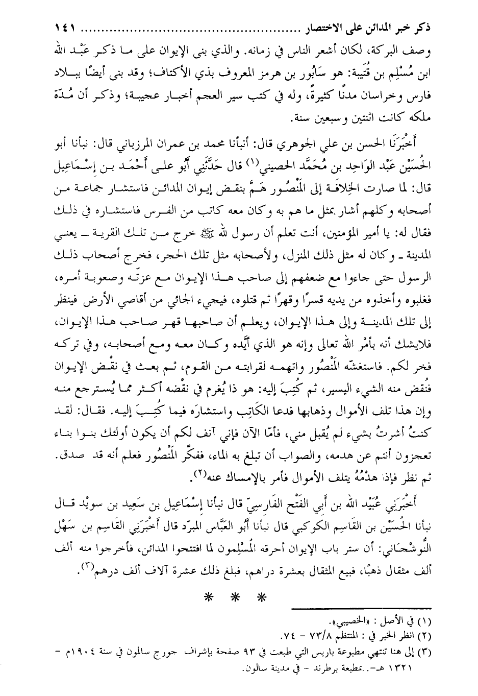 أَخْبَرَنِي عُبَيْد الله بْن أَبِي الفتح الفارسي قال نبأنا إسماعيل بن سعيد بن سويد قال نبأنا الحسين بن القاسم الكوكبي قال نبأنا أَبُو الْعَبَّاسِ المبرد قَالَ أَخْبَرَنِي القاسم بْن سهل النوشجاني: أن ستر باب الإيوان أحرقه المسلمون لما افتتحوا المدائن، فأخرجوا منه ألف ألف مثقال ذهبا، فبيع المثقال بعشرة دراهم، فبلغ ذلك عشرة آلاف ألف درهم [3] .