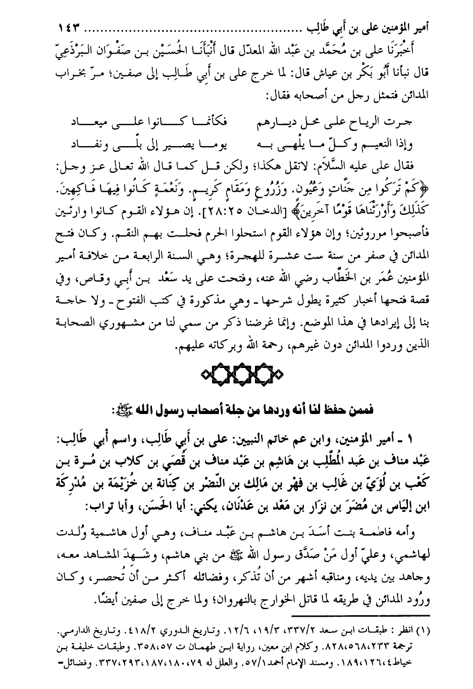 1- أمير المؤمنين، وابن عم خاتم النبيين: علي بْن أَبِي طالب، واسم أَبِي طالب [1] : عَبْد مناف بْن عَبْد المطلب بْن هاشم بْن عَبْد مناف بْن قصي بن كلاب بن مرة بن كعب بن لؤي بن غالب بن فهر بن مالك بن النضر بن كنانة بن خزيمة بن مدركة ابن إلياس بْن مضر بْن نزار بْن معد بْن عدنان، يكنى: أبا الْحَسَن، وأبا تراب:
