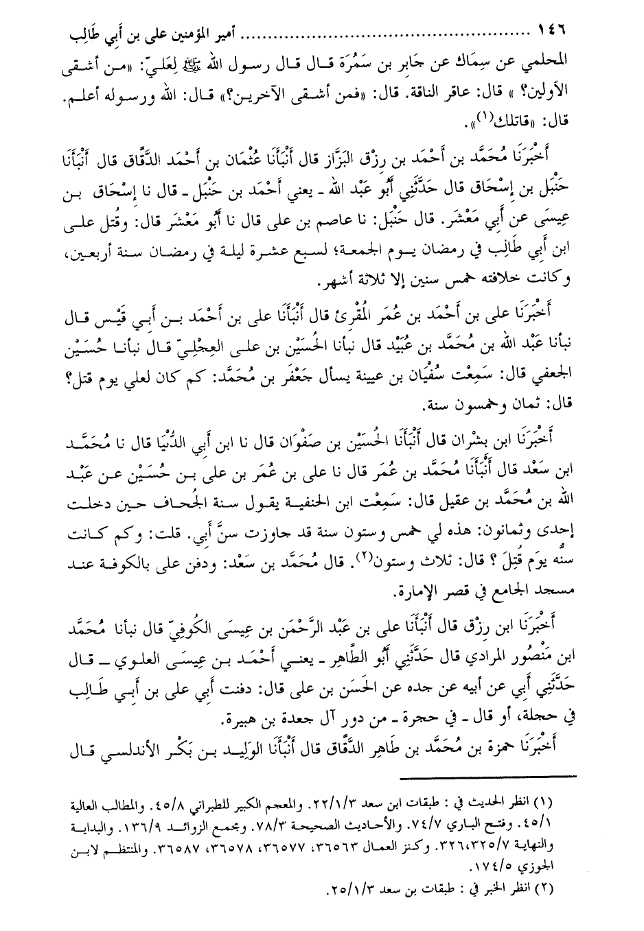 أَخْبَرَنَا عَلِيّ بْن أَحْمَد بن عمر المقرئ قال أنبأنا علي بن أحمد بن أبي قيس قَالَ نبأنا عَبْدُ الله بْن مُحَمَّد بْن عبيد قَالَ نبأنا الحسين بن على العجليّ قال نبأنا حسين الجعفي قَالَ: سمعت سفيان بْن عيينة يسأل جعفر بْن مُحَمَّد: كم كان لعلي يوم قتل؟