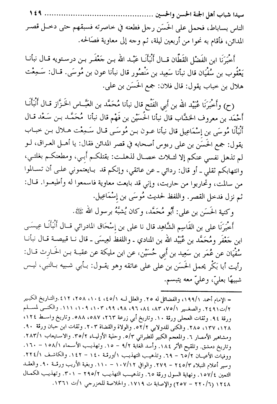 أَخْبَرَنَا ابْنُ الْفَضْلِ الْقَطَّانُ قَالَ أنبأنا عبد الله بن جعفر بن درستويه قال نبأنا يعقوب بن سفيان قال نبأنا سعيد بن منصور قال نبأنا عَوْنُ بْنُ مُوسَى. قَالَ: سَمِعْتُ هِلالَ بْنَ خَبَّابٍ يَقُولُ: قَالَ فُلانٌ: جَمَعَ الْحَسَنُ بْنُ على.