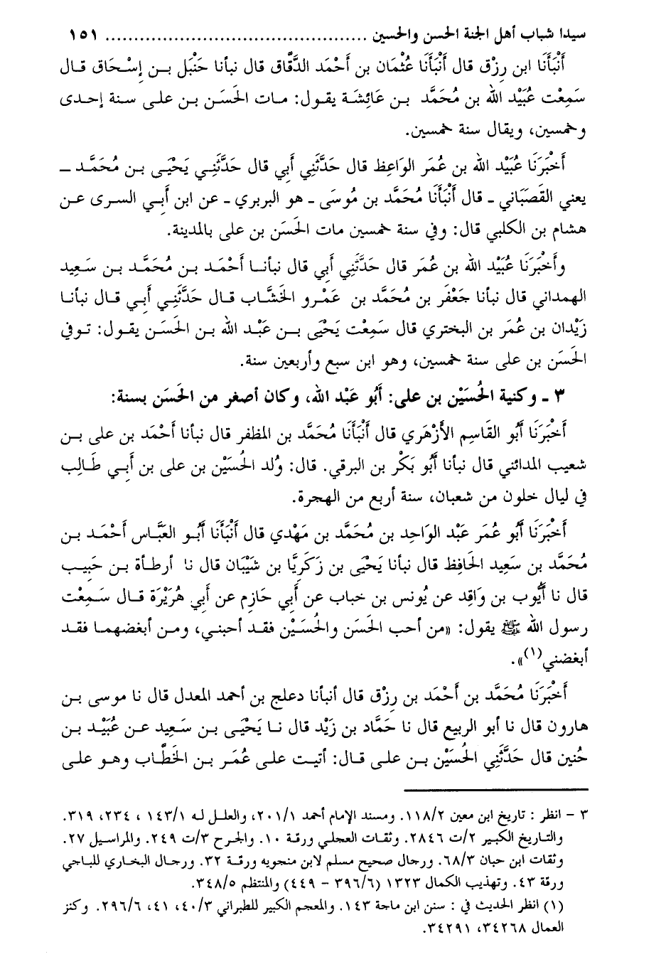 أَخْبَرَنَا أَبُو عُمَرَ عَبْدُ الْوَاحِدِ بْنُ مُحَمَّدِ بْنِ مَهْدِيٍّ قَالَ أنبأنا أَبُو العباس أَحْمَد بْن مُحَمَّد بْن سعيد الحافظ قال نبأنا يحيى بن زكريّا بن شيبان قال نا أرطأة بن حبيب قال نا أَيُّوبُ بْنُ وَاقِدٍ عَنْ يُونُسَ بْنِ خَبَّابٍ عَنْ أَبِي حَازِمٍ عَنْ أَبِي هُرَيْرَةَ قَالَ سَمِعْتُ رَسُولَ اللَّهِ صَلَّى اللَّهُ عَلَيْهِ وَسَلَّمَ يَقُولُ: «مَنْ أَحَبَّ الْحَسَنَ وَالْحُسَيْنَ فَقَدْ أَحَبَّنِي، وَمَنْ أَبْغَضَهُمَا فَقَدْ أَبْغَضَنِي [2] »