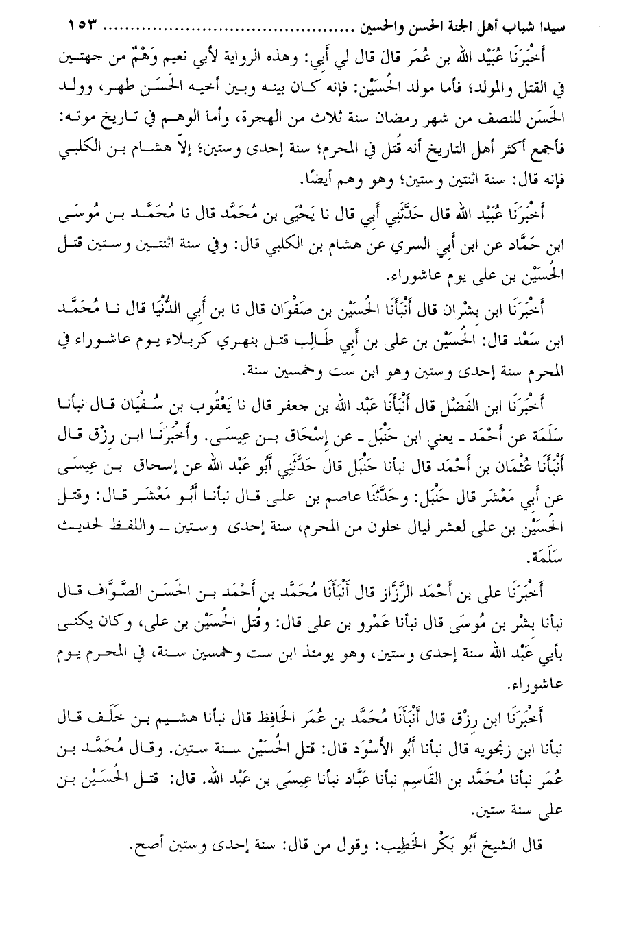 أَخْبَرَنَا عبيد اللَّه بْن عُمَر قَالَ قَالَ لي أَبِي: وهذه الرواية لأبي نعيم وهم من جهتين في القتل والمولد؛ فأما مولد الحسين: فإنه كان بينه وبين أخيه الْحَسَن طهر، وولد الْحَسَن للنصف من شهر رمضان سنة ثلاث من الهجرة، وأما الوهم في تاريخ موته: