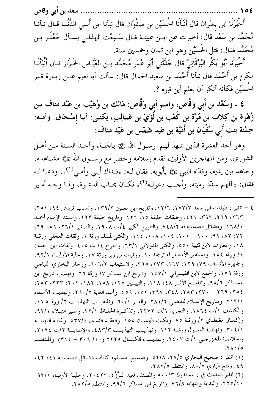 4- وسعد بن أبي وقاص، واسم أَبِي وقاص: مالك بْن وهيب بْن عَبْد مناف بْن زهرة بْن كلاب بْن مرة بْن كعب بْن لؤي بْن غالب، يكنى: أبا إِسْحَاق. وأمه: حمنة بنت أَبِي سفيان بْن أمية بْن عَبْد شمس بْن عَبْد مناف [1] :